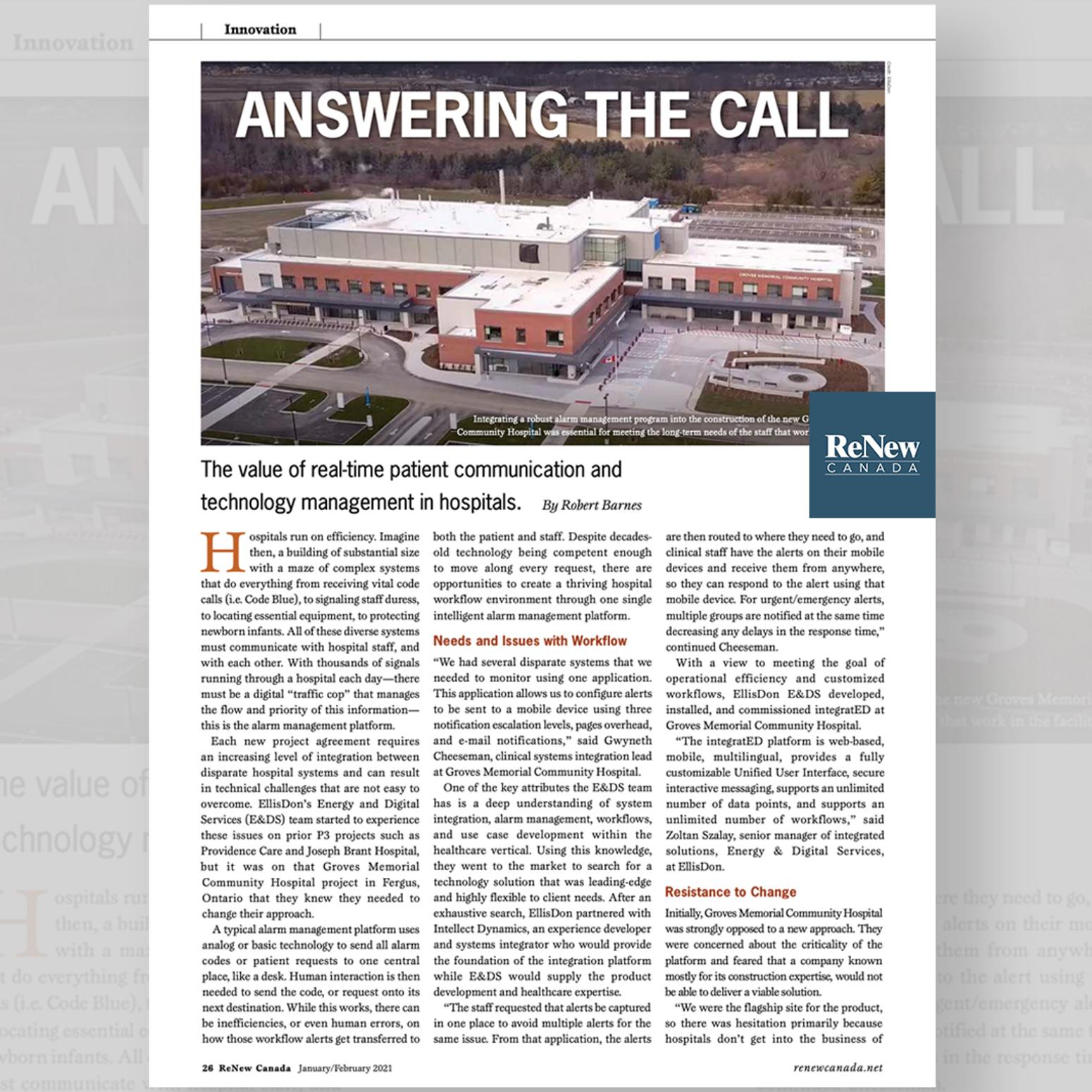 EllisDon’s Energy and Digital Services (E&DS) team was recently featured in ReNew Canada’s January/February 2021 Issue. The article, featured on page 26 and 27, highlights how E&DS developed, installed, and commissioned ‘intergratED’, an Alarm & Event Management platform fully customizable to the hospital’s needs and long-term goals.“Implementing integratED gave us the opportunity to rethink and redesign many of our workflows, because now the technology could keep pace and actually align our care delivery workflows to our patient safety and experience goals,” said Rebecca Stuart, Director, Quality and Patient Safety, Groves Memorial Community Hospital.To read the full article on the success of the new intelligent alarm management platform and how it sets the stage to solve operational challenges through technology, click HERE and scroll to page 26.