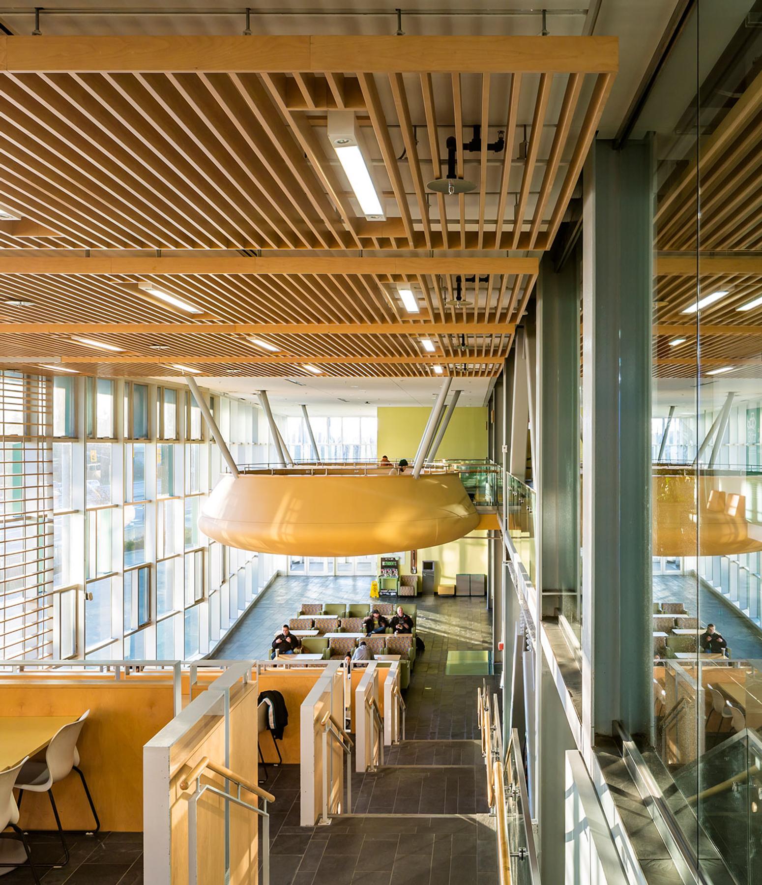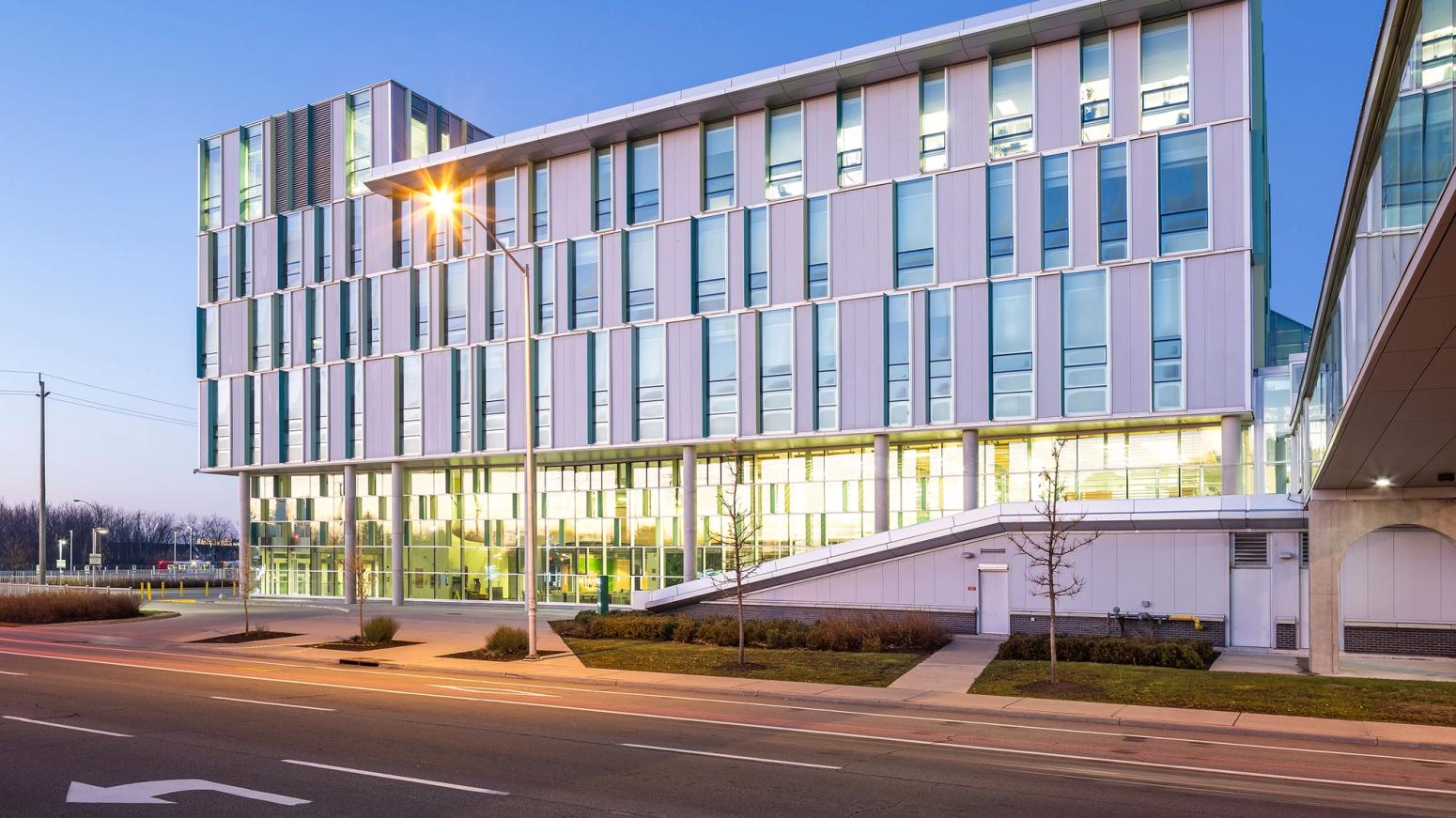EllisDon also constructed a new pedestrian bridge that connects the existing building to the new building and to the new transit station allowing students to travel safely across an arterial street; as well as a new light rail transit tunnel. In terms of sustainability features, a green roof with native vegetation is accessible to students and visitors. The atrium is the home of a five storey bio-wall that helps clean indoor air and control humidity levels. The site plan was designed to collect all stormwater and rainwater in a cistern, which is used to flush toilets. EllisDon supervised and managed both the design and construction process which included the coordination of over 25 subcontractors and 10 consulting firms under subcontract agreements. All of these firms worked seamlessly together in a fast-track Design-Build environment to complete the project on time and on budget.