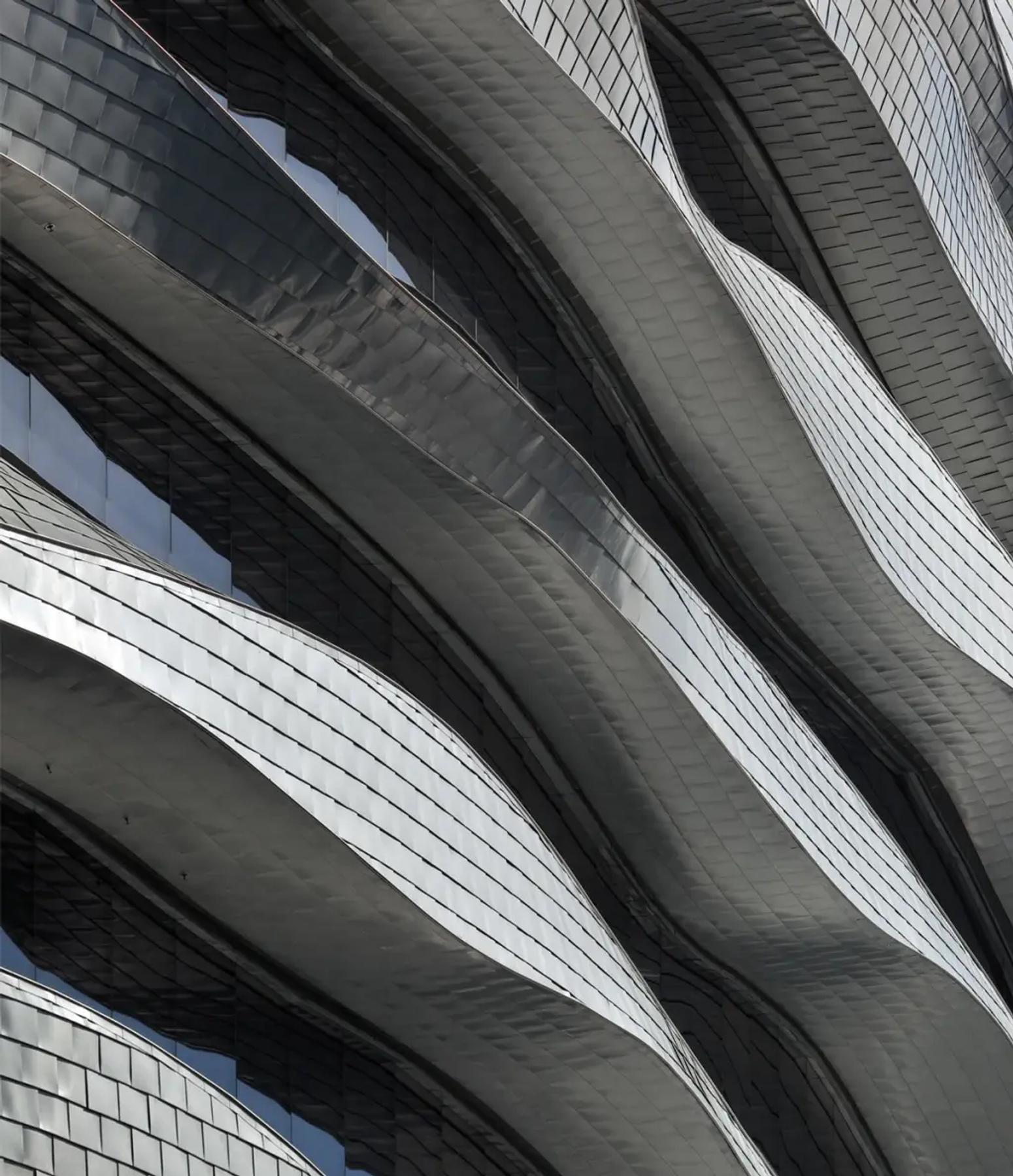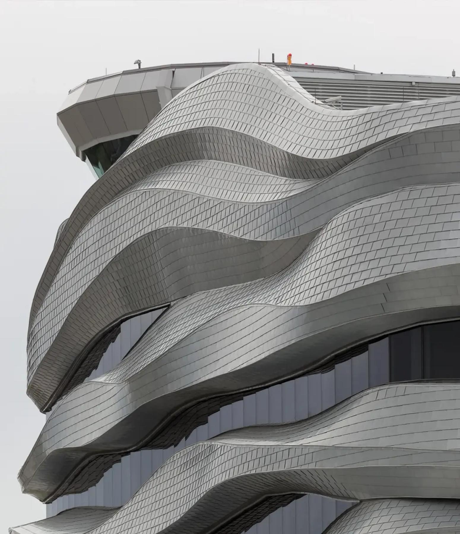 The exterior envelope consists mainly of zinc panels and triple glazed strip windows. Each section of zinc paneling is uniquely molded to permit downward viewing angles and reduce solar gain. The building skin was designed to give visiting passengers a unique and lasting impression of Edmonton when entering and leaving the city. The new tower also mimics the unimpeded winds, prairie fields and distinct seasons that dominate the capital region.