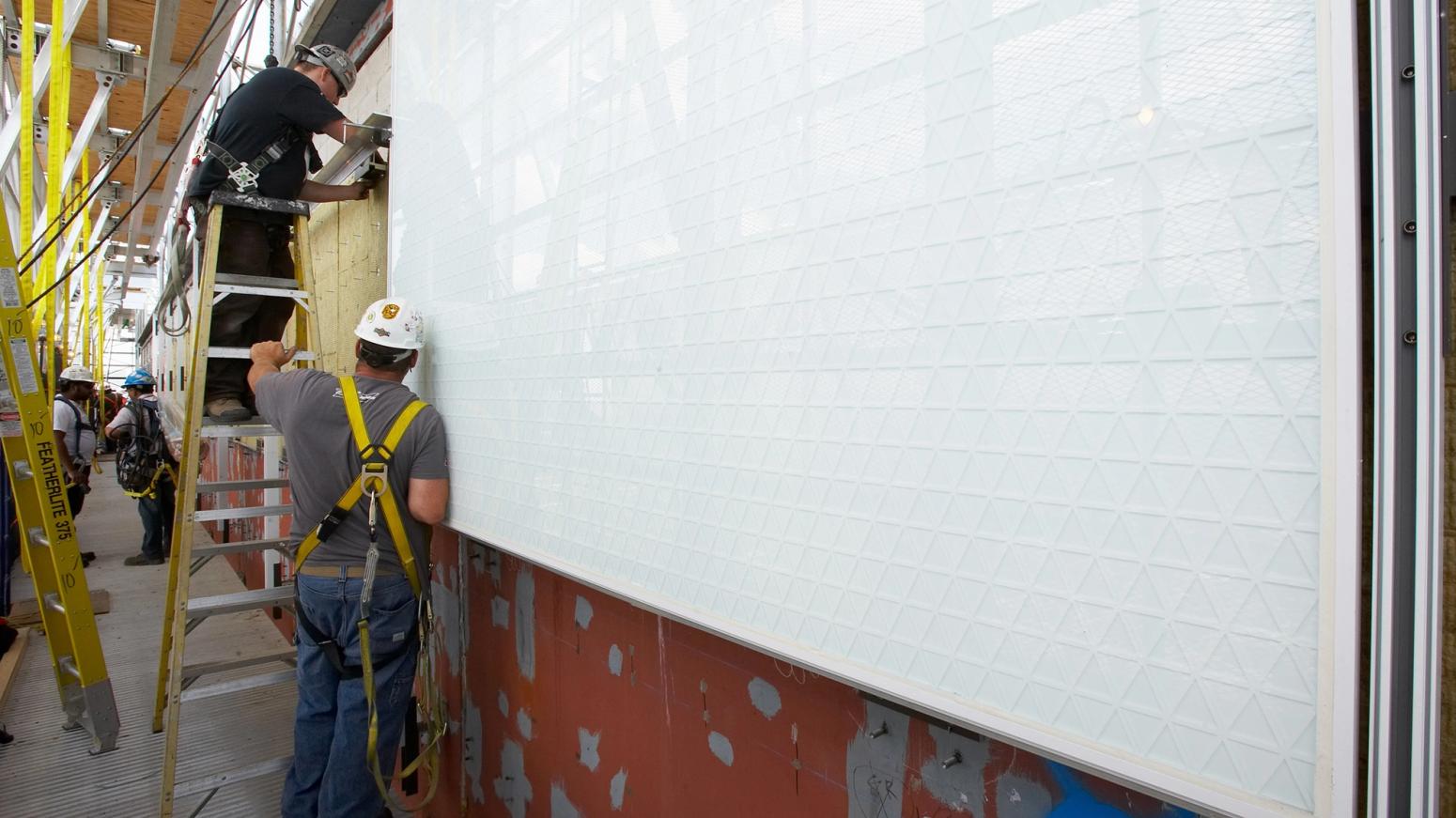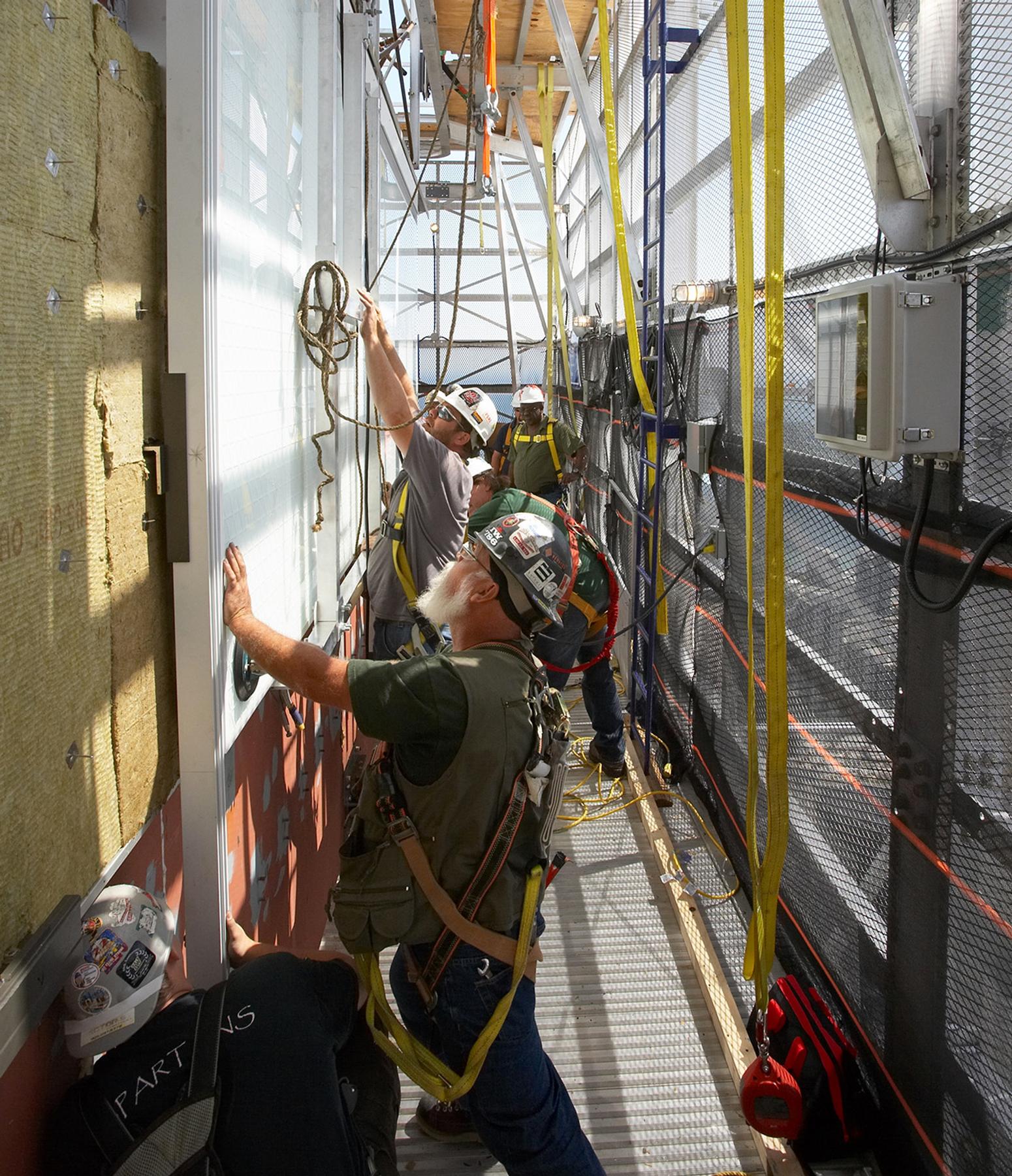 The existing 455,000 square feet of marble cladding which consisted of approximately 45,000 panels was removed and replaced with a visibly updated, durable and energy efficient building envelope consisting of white ceramic fritted glass, triple glazed, unitized spandrel panels. Given the location of the site in the downtown core and the limitations of working completely from the exterior of the building the development of a suitable access system was an extremely challenging undertaking.