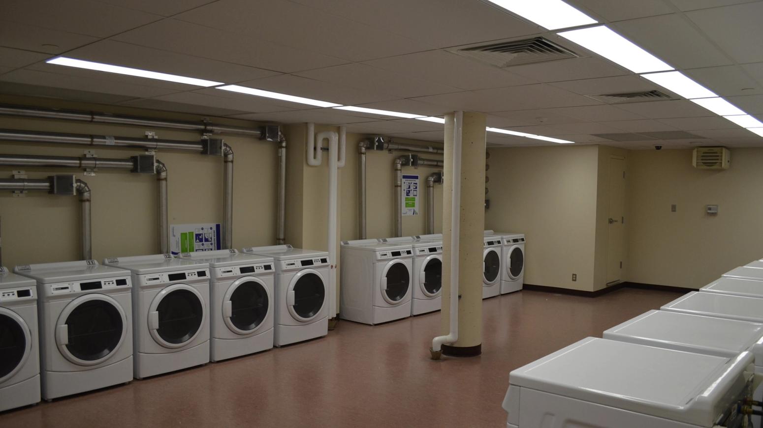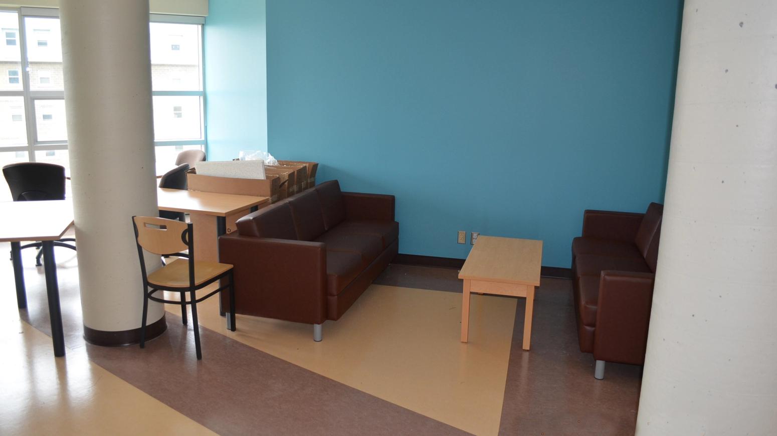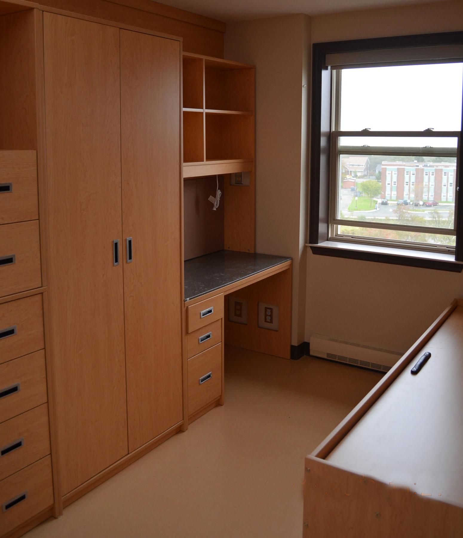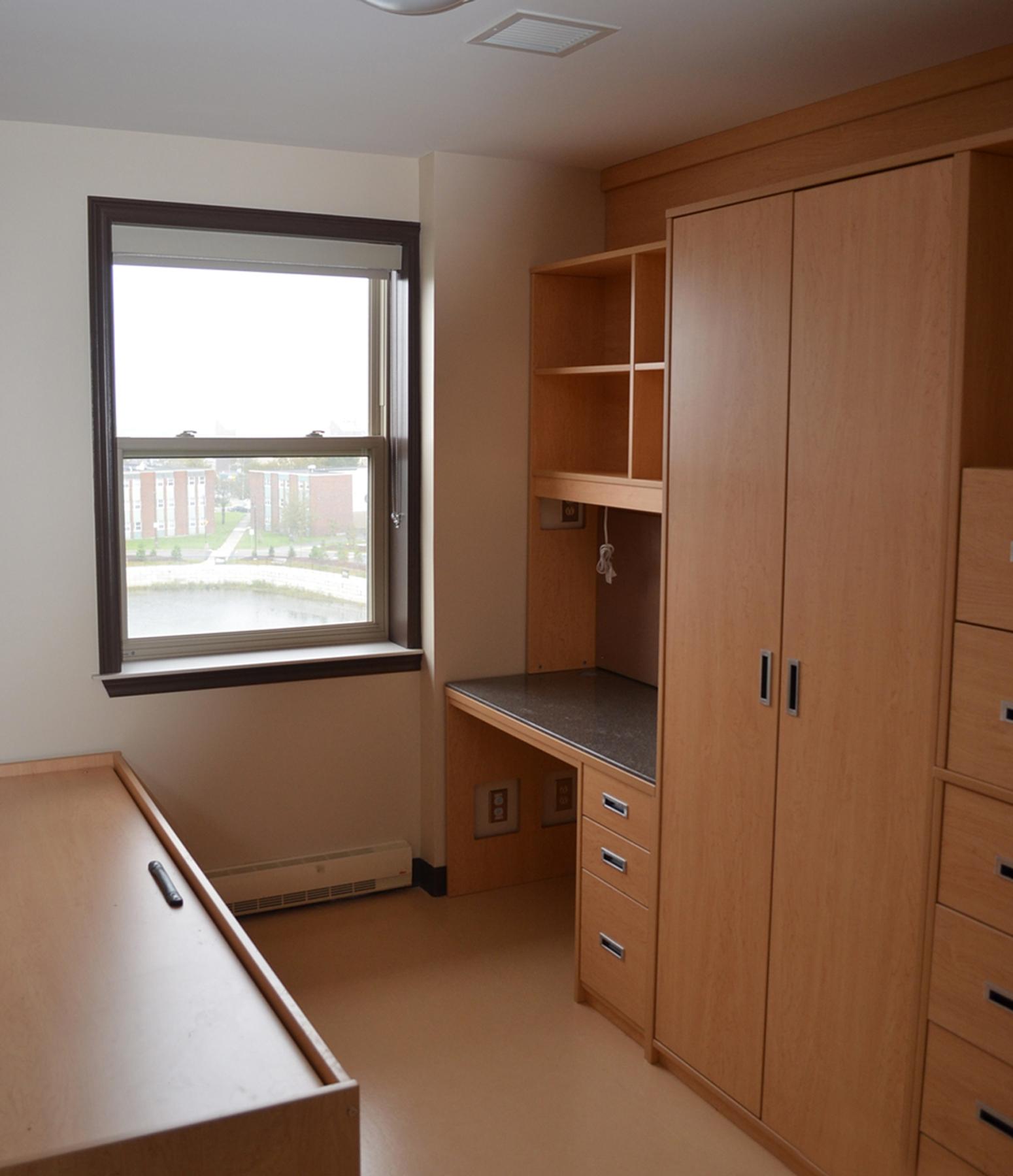 The interior of the residence buildings consist of painted drywall and concrete, ceiling tile, and tiled bathrooms. The exterior consists of concrete masonry units, and vinyl windows on the upper floors, and the ground floor contains curtain wall windows.