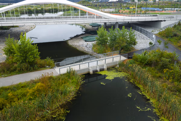 Over 1.4 million cubic metres of soil were removed to create a naturalized river valley with channels and wetlands to mimic local ecosystems. Advanced erosion control and native plantings protect the banks, while a network of stormwater and utility systems, equipped with smart sensors, adapts to both minor and extreme weather events.