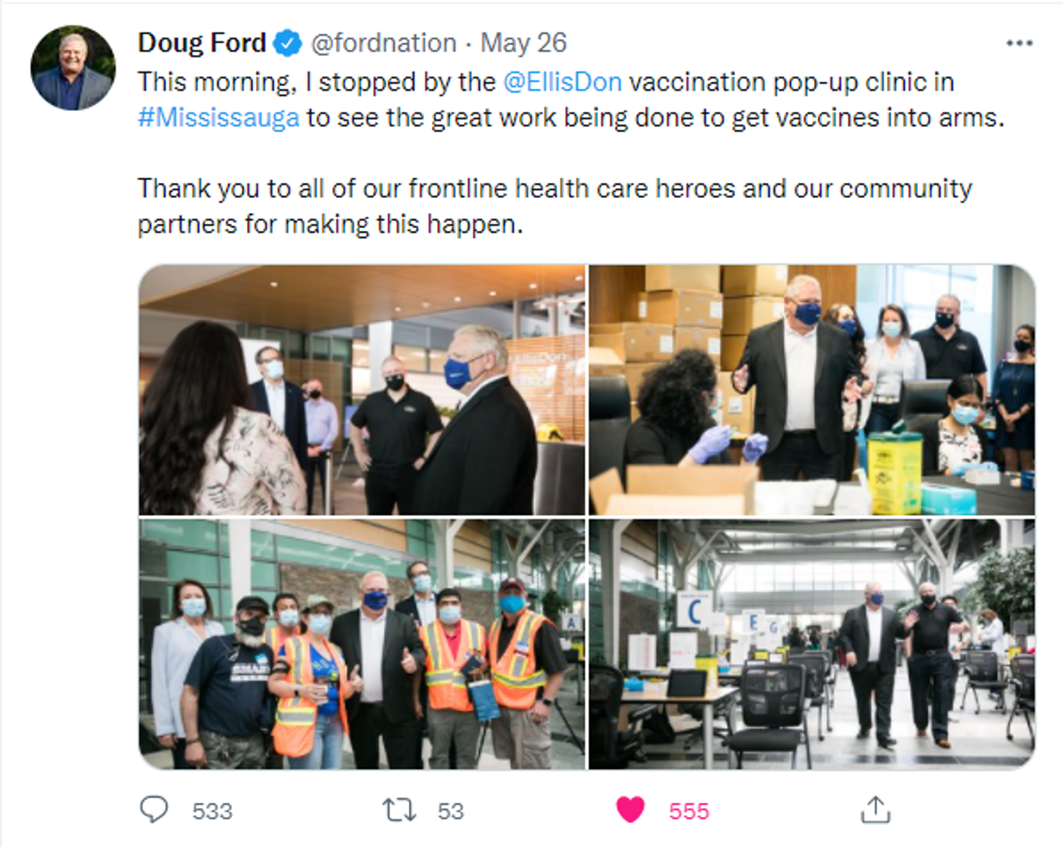 The clinic resulted in an outpour of positive feedback and gratitude for EllisDon’s commitment to keeping our communities safe. Ontario Premier Doug Ford also recognized EllisDon for its efforts and even visited the clinic himself.