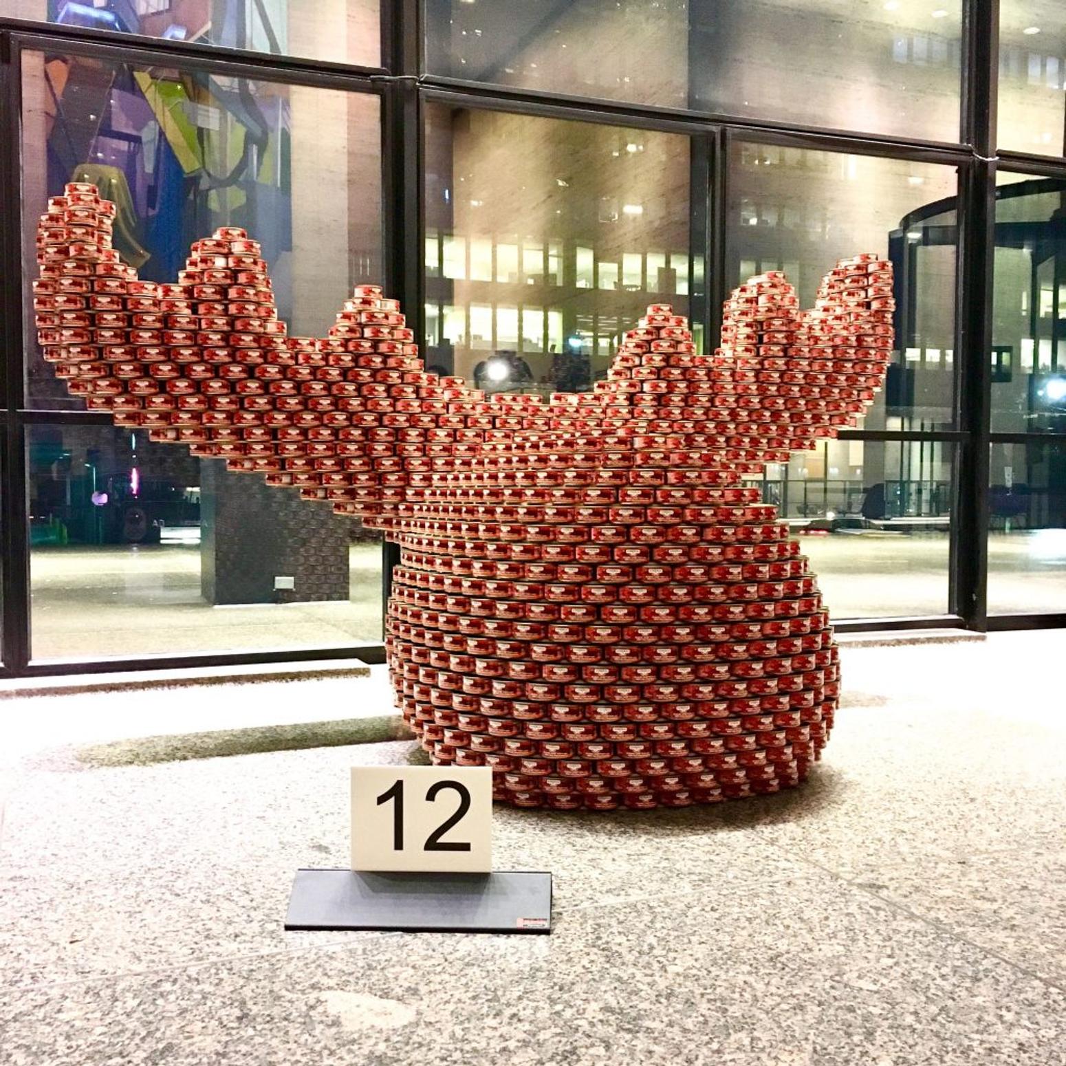 EllisDon’s submission, the CANadian Moose, a massive head and rack of antlers in the colours of the Canadian flag, was created from 2,784 cans of tuna! The stylized design was inspired by a moose grazing in a lake, showing only its head and antlers above the water. To create the complex curves, the sculpture was modelled using Revit, a BIM software, to generate a level-by-level layout for the precise placement of each can- a critical component to maintaining balance and structural integrity across the broad antlers.