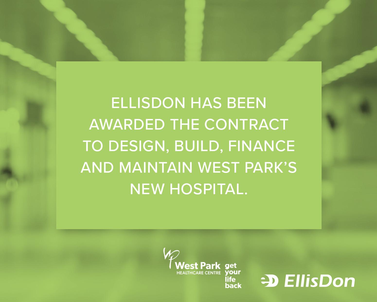 finance, and maintain the redevelopment project.“As the first hospital in Ontario to include community benefits, West Park Healthcare Centre is a very exciting undertaking for EllisDon,” said Joey Comeau, SVP Capital, EllisDon. “As builders who are deeply rooted in the communities we build in, EllisDon is proud to be awarded the opportunity to collaborate on a project that will keep social and economic community benefits at the forefront before, during, and after construction.” West Park provides specialized rehabilitation; complex continuing care, long-term care and community health services helping individuals manage difficult health challenges like lung disease, diabetes, stroke, amputation and musculoskeletal issues arising from a life-changing event or illness.The development project will include a new, approximately 730,000 square foot hospital building, providing various inpatient, outpatient, and outreach services. Outpatient care space will be significantly increased to accommodate current and new services such as geriatric clinics and day hospital, and satellite hemodialysis. Eighty per cent of the beds will be in single-patient rooms.Sustainable features and elements such as expansion of green space and extensive landscaping for outdoor therapy areas and therapeutic gardens will also be incorporated into the design. The project will target Leadership in Energy and Environmental Design (LEED®) Silver certification.Construction is set to begin immediately and substantial completion is slated for early 2023.View the full press release HERE