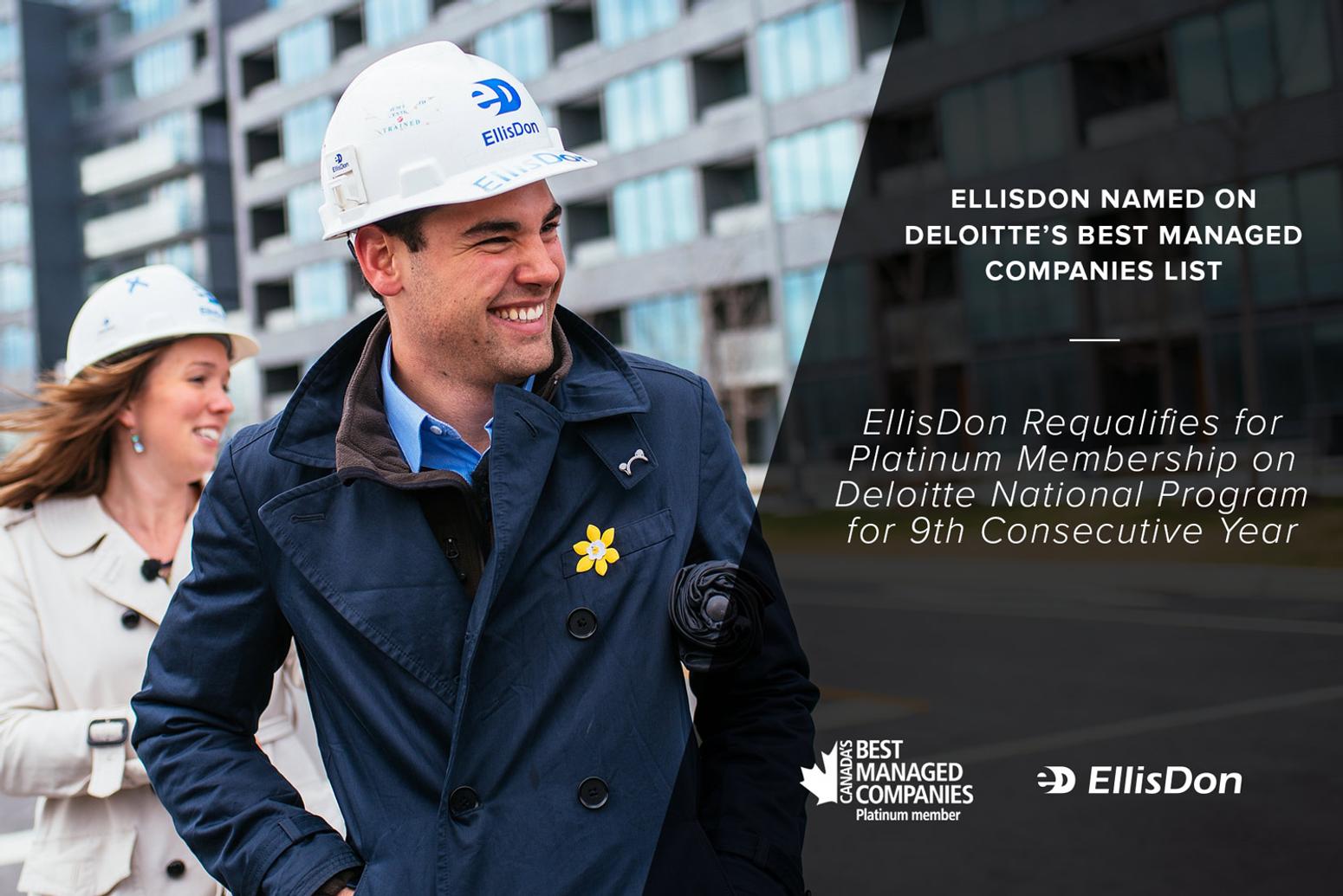 Mississauga, March 9, 2017— Today, Deloitte Canada released the winners of the 50 Best Managed Companies for 2017, with EllisDon making another appearance on the national program. The 50 Best Managed Companies program recognizes leading organizations for making the Best Managed list for seven consecutive years or more. This year, EllisDon requalified for platinum designation for the 9th consecutive year.Aside from numerous marketing and public relations benefits, this designation offers winners a spotlight in a Canada’s Best Managed Companies special report in Maclean’s magazine and Canadian Business (online), released today. These special editions will also identify EllisDon as a Platinum Club member.Geoff Smith, EllisDon’s President and CEO, credits his employees for these consecutive wins. “What we’ve come to realize from a moral point of view — as well as from a very pragmatic business point of view— is if you put employees first, clients get great experiences and shareholders get great returns,” said Smith. “You don’t even need to think about it. It just happens.”Sponsored by Deloitte, CIBC, National Post, Queen’s School of Business and MacKay CEO Forums, and attracting hundreds of applicants with over $15 million in revenue yearly, the Canada’s 50 Best Managed Companies program recognizes organizations that set the highest standards of business performance. Awards are distributed on three levels: Best Managed Companies winner (one of 50 new winners selected yearly); Requalified member (repeat winners that retain the title two additional years); Gold Standard member (repeat winners that retain the title for over three years); and Platinum Club member (repeat winners that retain the title for seven years or more)."While many companies look only to revenue growth as a key marker of success, Best Managed companies take strategic risks to grow in a number of different ways," said Lorrie King, National Co-Leader of Canada's Best Managed Companies program and Partner at Deloitte. "It's this adaptability and approach to business that sets them apart from the status quo."Now in its 24th year, the Best Managed designation has become a symbol of Canadian corporate success, and a credit to those companies that hold true to their core vision, create stakeholder value, and excel in the global economy.This year’s top 50 companies will be celebrated at the Canada’s Best Managed Companies symposium and gala, to be held at the Metro Toronto Convention Centre on the evening of April 19, 2017.