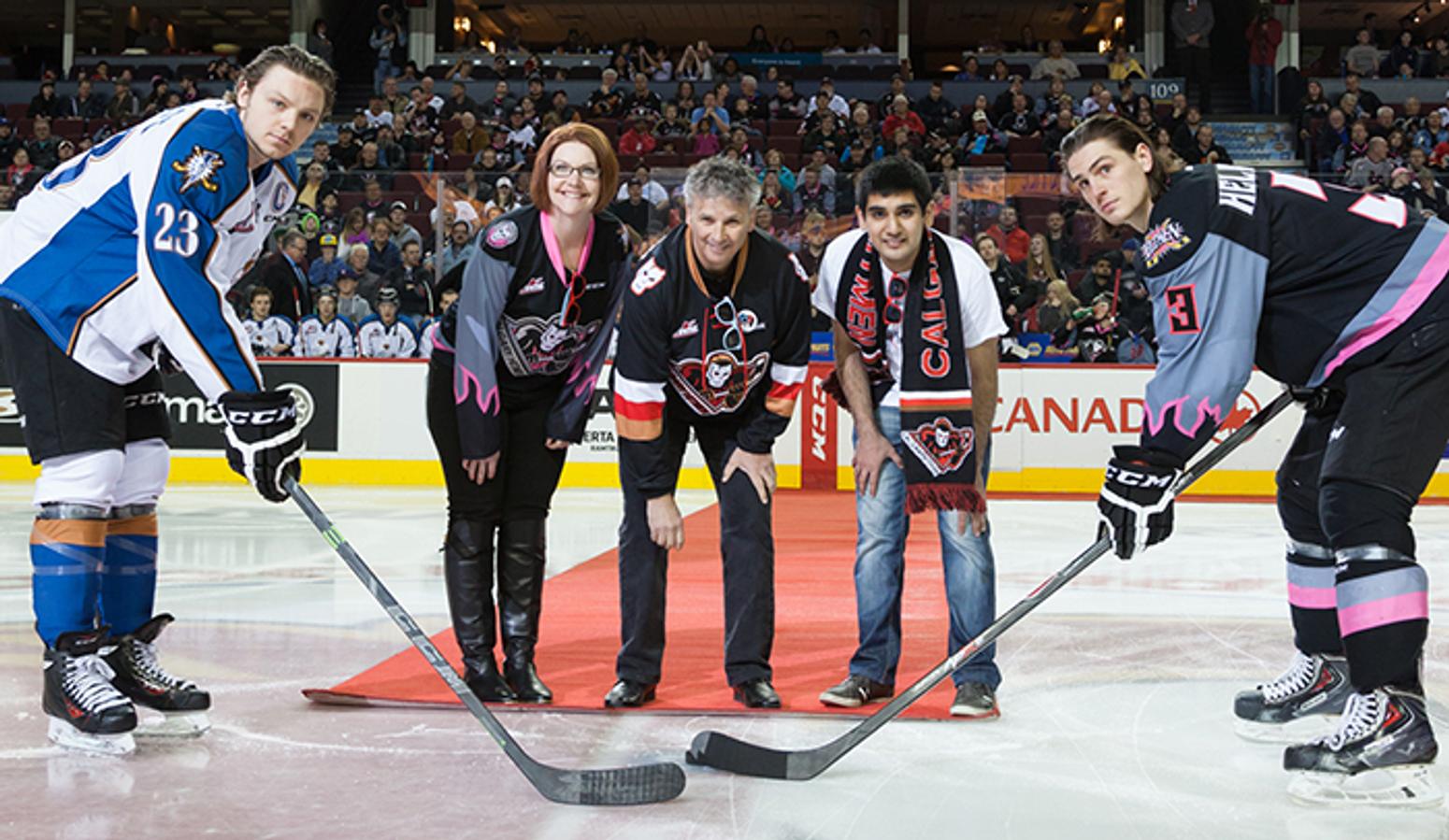 Vince Davoli (centre) attends ceremonial puck drop at Calgary Hitmen game