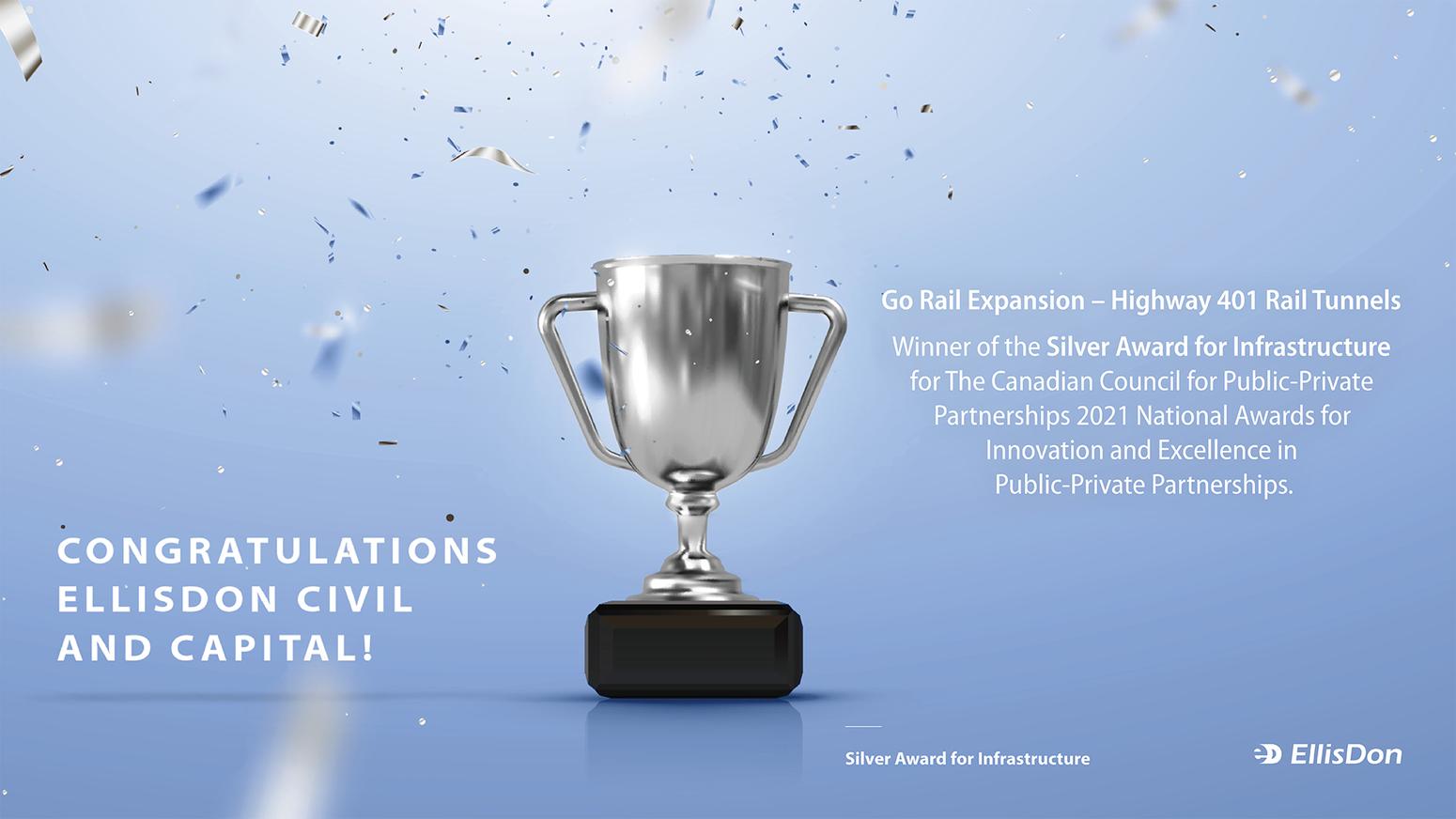 EllisDon’s GO Rail Expansion - Highway 401 Rail Tunnels project has been selected as the winner of the Silver Award for Infrastructure for the Canadian Council for Public-Private Partnerships (CCPPP) 2021 National Awards for Innovation and Excellence in Public-Private Partnerships.The CCPPP Awards are presented annually to showcase Canadian excellence and innovation in public-private partnerships, project financing, service delivery, infrastructure investment and the generation of economic benefit, which result in enhanced quality of public services and facilities.The GO Rail Expansion - Highway 401 Rail Tunnels project involved the construction of twin tunnels, with one rail line each, under the interchange of Highway 401 and 409 and was selected for the Silver Award for its many innovative approaches to address construction challenges.With Highway 401 being the busiest highway in North America, the project team took care to bring in new boring technology, utilized a a sequential excavation method for traffic management to ensure all lanes of the highway remained operational, and a complex network of monitors that covered the surface of the highway as well as the existing tunnels and the surrounding earth.The pre-recorded Awards presentation will take place on Wednesday, November 17th, the second day of the CCPPP Virtual Conference with Awards announced between 2:15 and 3:00 pm. (ET).To learn more about the CCPPP Awards, click here.