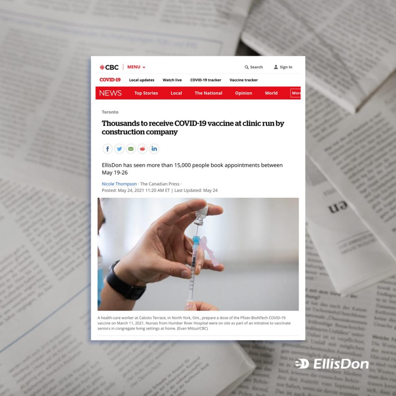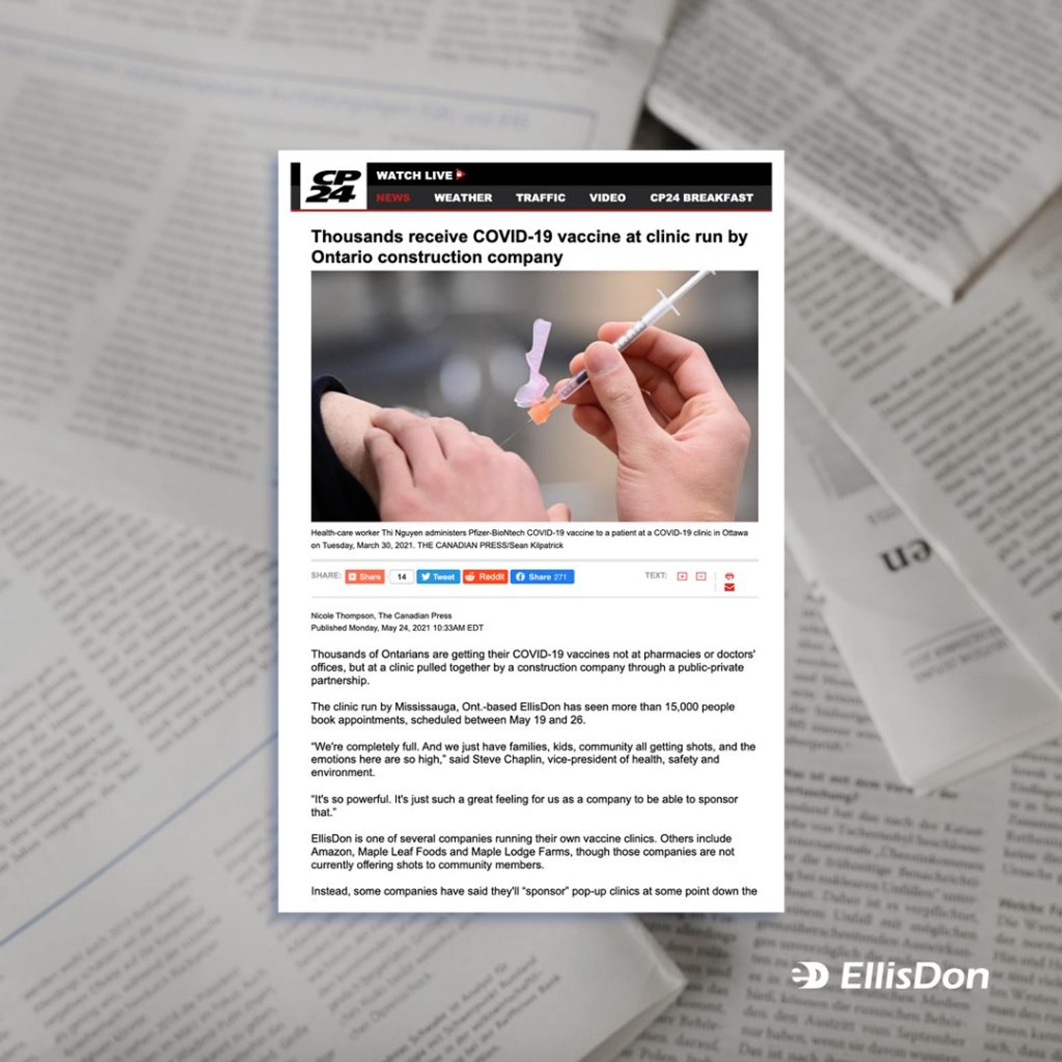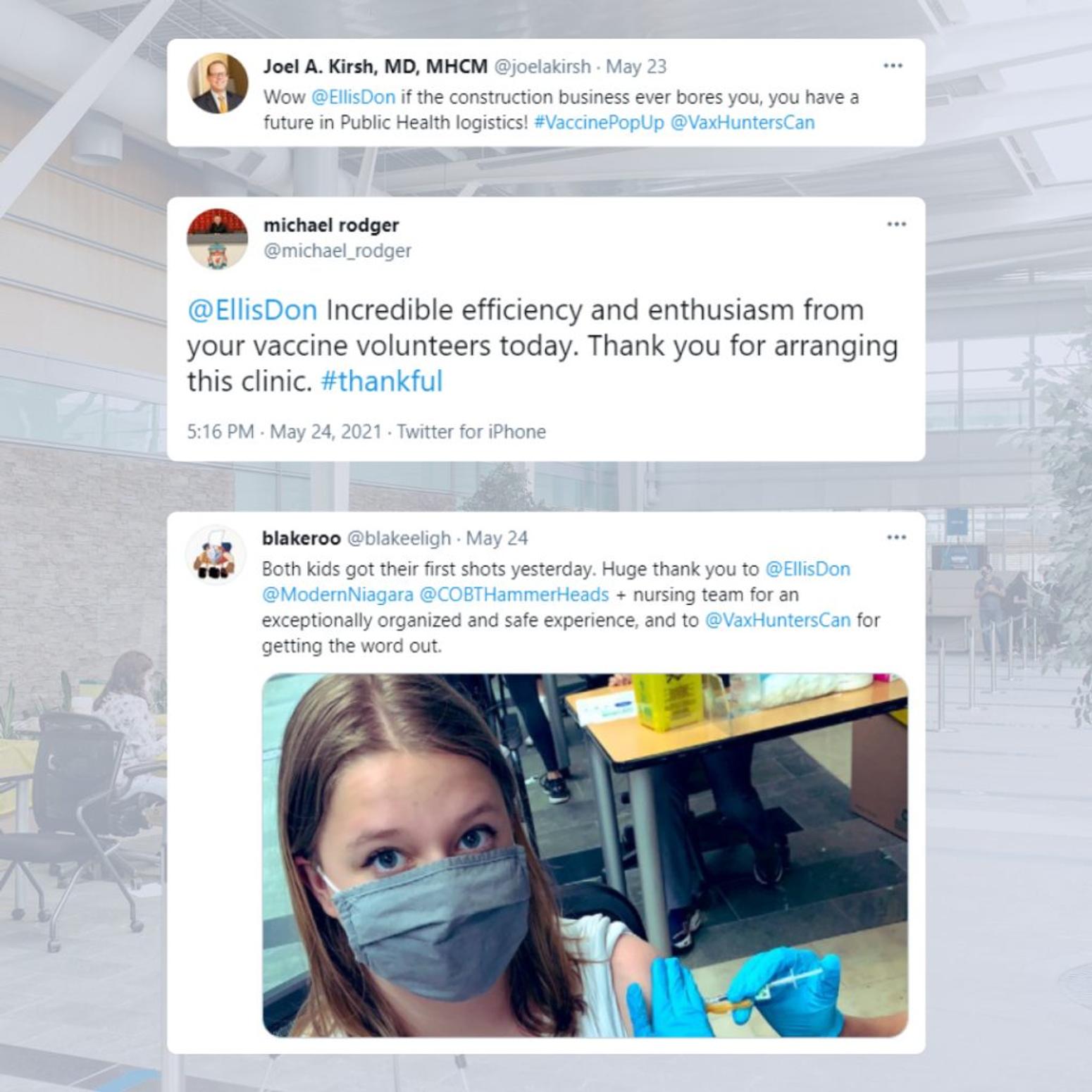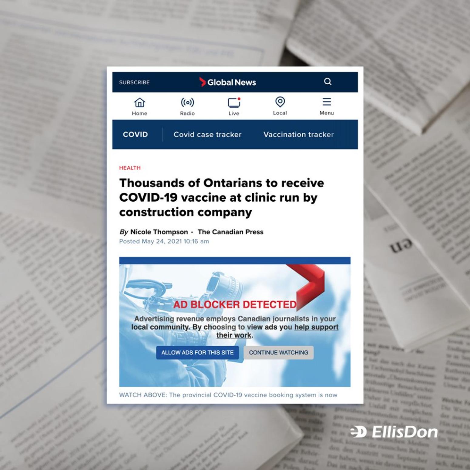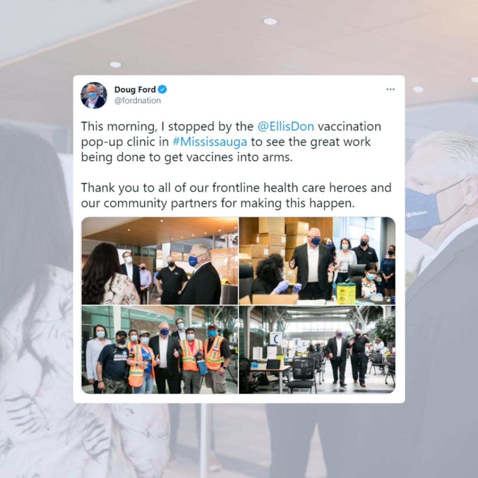 EllisDon, in partnership with Flynn, Modern Niagara and Central Ontario Building Trades (COBT), hosted a COVID-19 Vaccination Pop-Up Clinic at the Mississauga headquarters office building from Wednesday, May 19th to Saturday, May 29th. With the help of many volunteers, health care workers and staff, the Pop-Up Clinic helped to vaccinate just under 14,000 Ontarians! EllisDon sends out a sincere thank you to our partners at Flynn, Modern Niagara, Central Ontario Building Trades, various donors, staff and the Region of Peel for coming together and making our COVID-19 Vaccination Pop-Up Clinic a huge success. Please see a full list of our partners, donors and staff who made this pop-up clinic a great success: