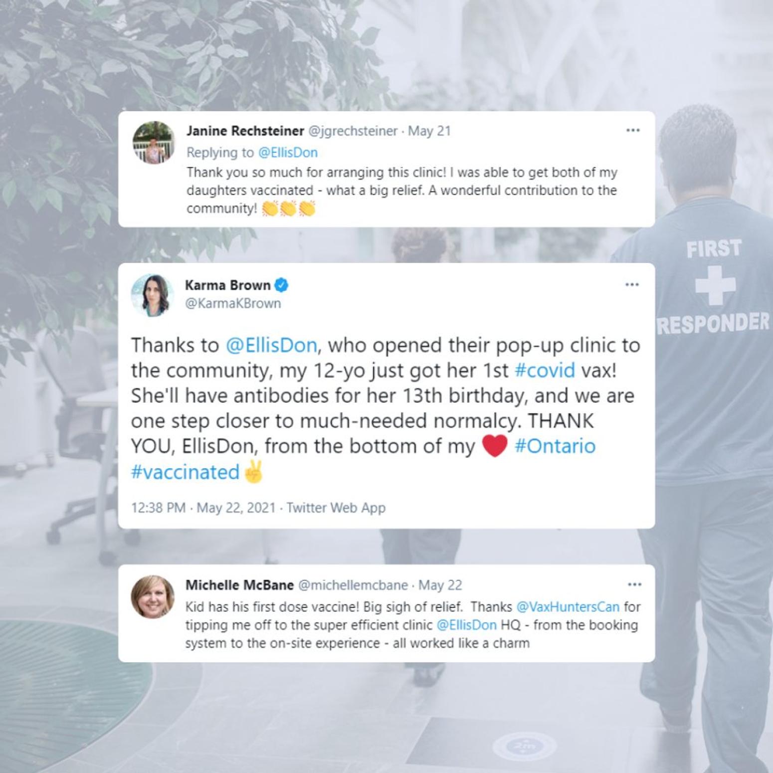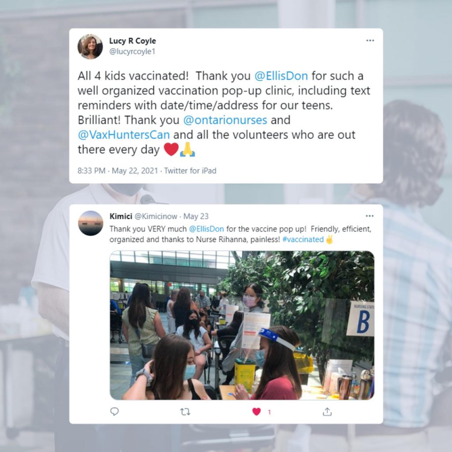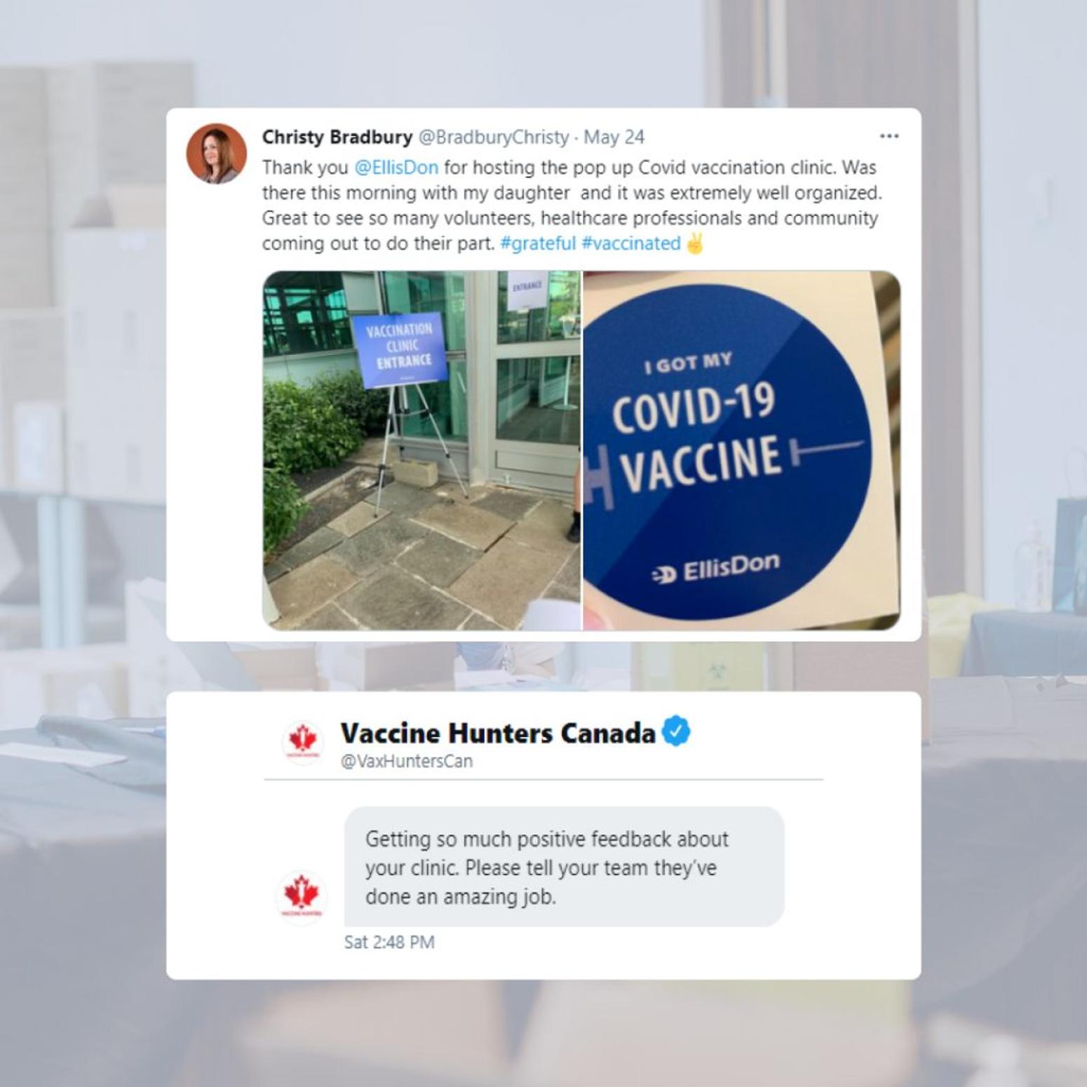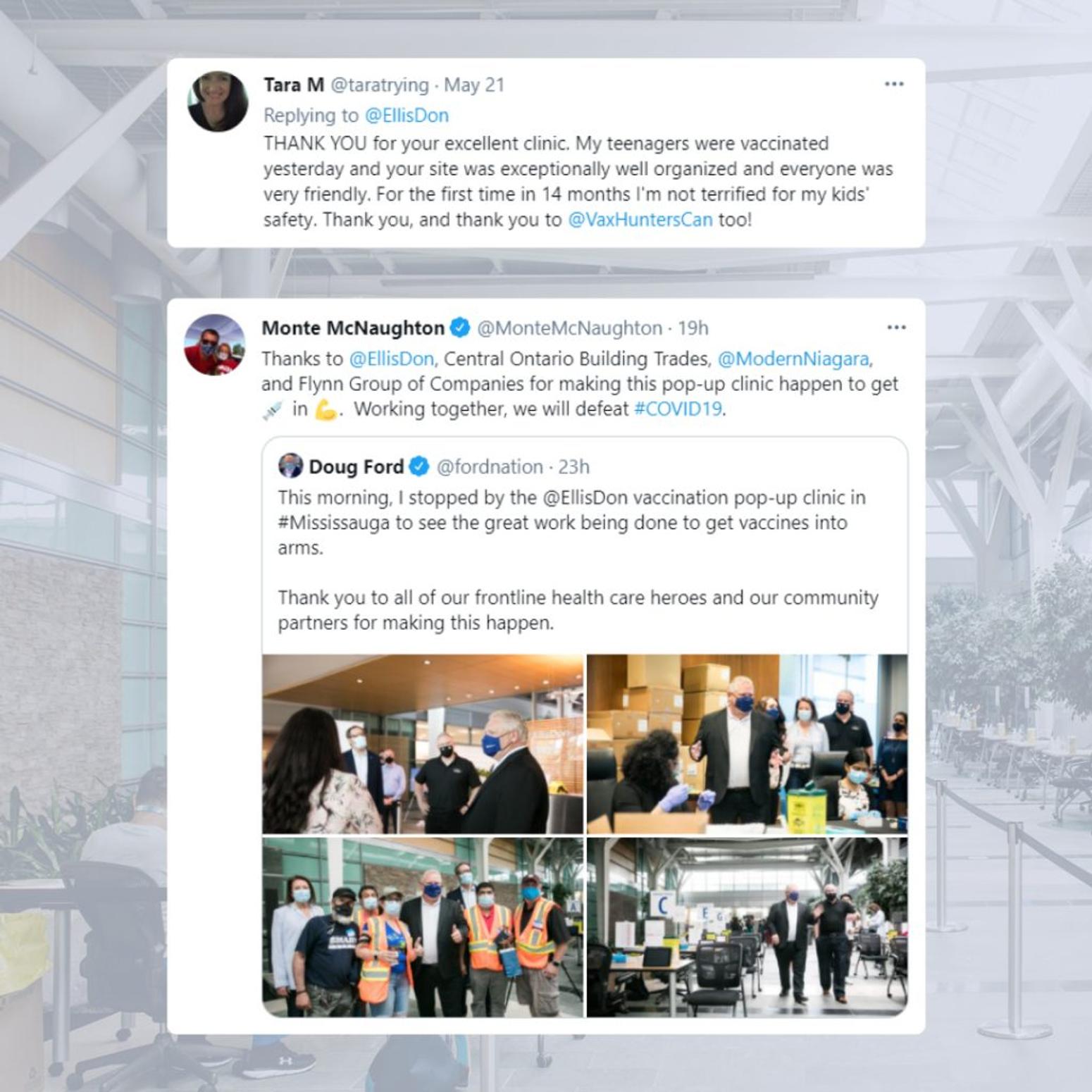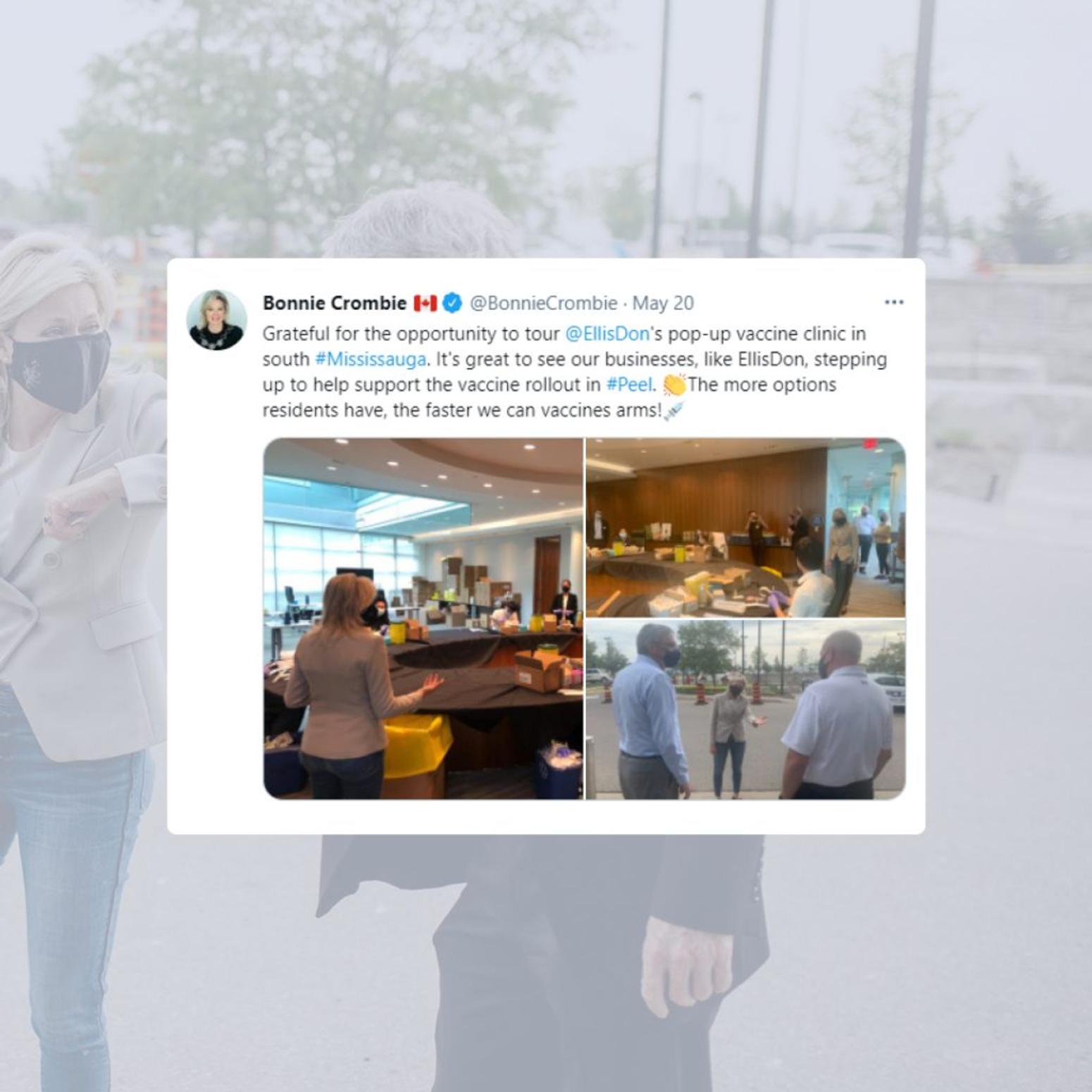 EllisDon, in partnership with Flynn, Modern Niagara and Central Ontario Building Trades (COBT), hosted a COVID-19 Vaccination Pop-Up Clinic at the Mississauga headquarters office building from Wednesday, May 19th to Saturday, May 29th. With the help of many volunteers, health care workers and staff, the Pop-Up Clinic helped to vaccinate just under 14,000 Ontarians! EllisDon sends out a sincere thank you to our partners at Flynn, Modern Niagara, Central Ontario Building Trades, various donors, staff and the Region of Peel for coming together and making our COVID-19 Vaccination Pop-Up Clinic a huge success. Please see a full list of our partners, donors and staff who made this pop-up clinic a great success: