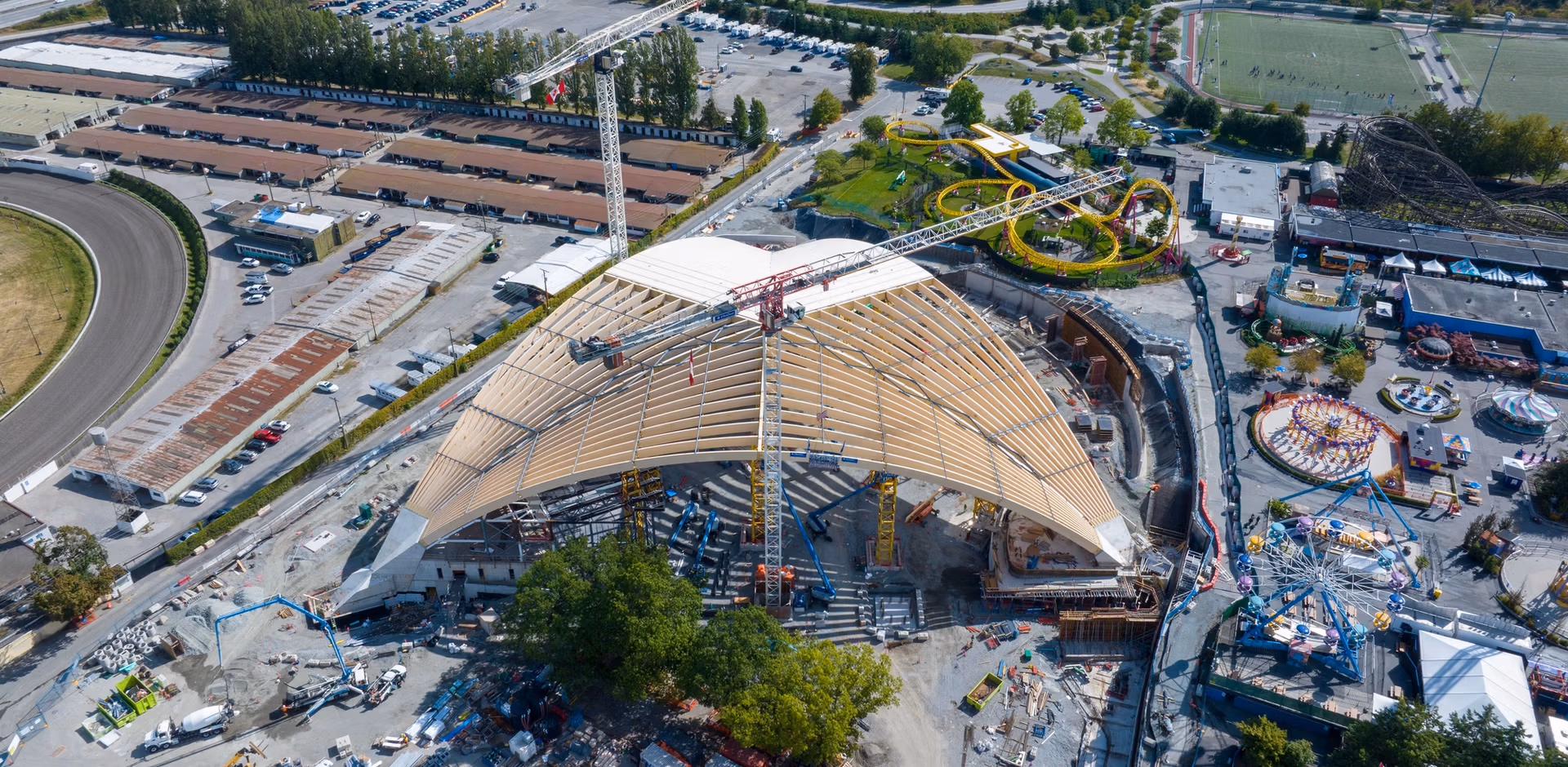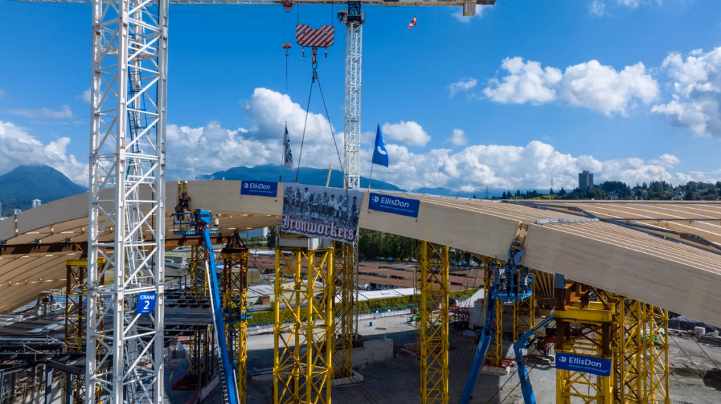 The final beam has been lifted into place atop the Freedom Mobile Arch, completing the canopy of what is now one of the world’s largest free-span mass timber structures. Constructed at a scale never before attempted, the canopy required meticulous planning and exceptional engineering. From its earliest stages, it stood apart as a uniquely ambitious undertaking that now reshapes Vancouver’s cultural landscape.