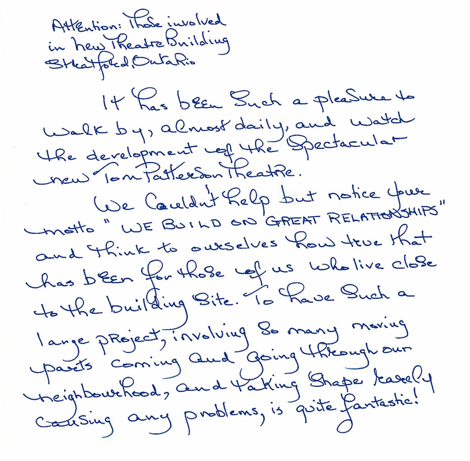 It’s always nice to hear positive feedback from our project neighbours. Last week, our London office received a wonderful handwritten note applauding our Tom Patterson Theatre construction team on living by our motto, “We build on great relationships.”