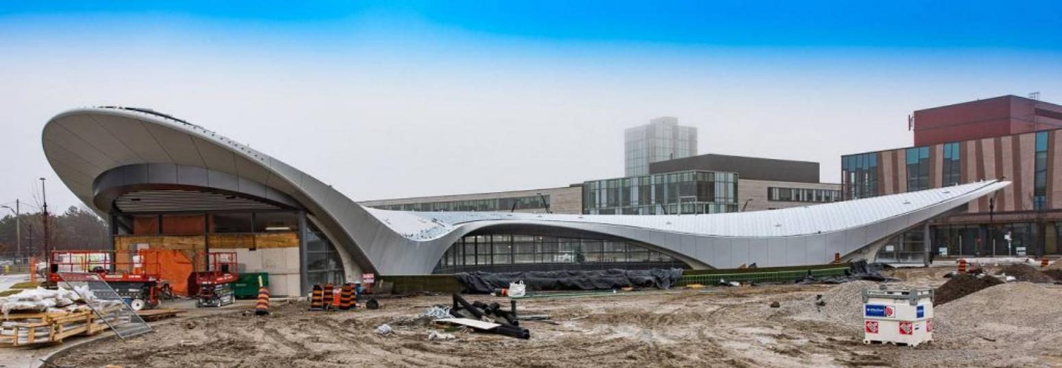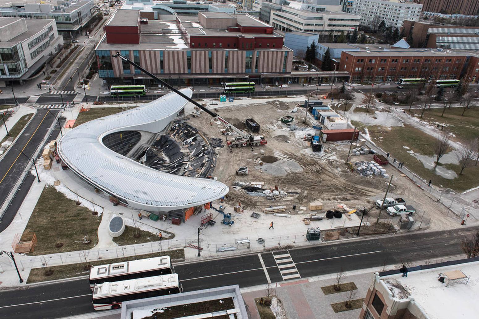 The sweeping roof that connects each station entrance provides a dramatic centrepiece in the York University Common, but it's also an environmental feature of the structure as its anodized aluminum panels reflect sunlight and absorb very little heat. The west-facing "light scoop" provides a stunning view for passengers exiting the station, but also allows for less reliance on electric light sources. Meanwhile the helix-like supports on the concourse level make the station appear futuristic without coming off as hokey. For all the design features, perhaps the best feature of all is just how much the new station will change transportation at York. On weekdays, thousands of TTC bus trips are made through the Common each day, many of which will be made redundant once the subway extension opens.