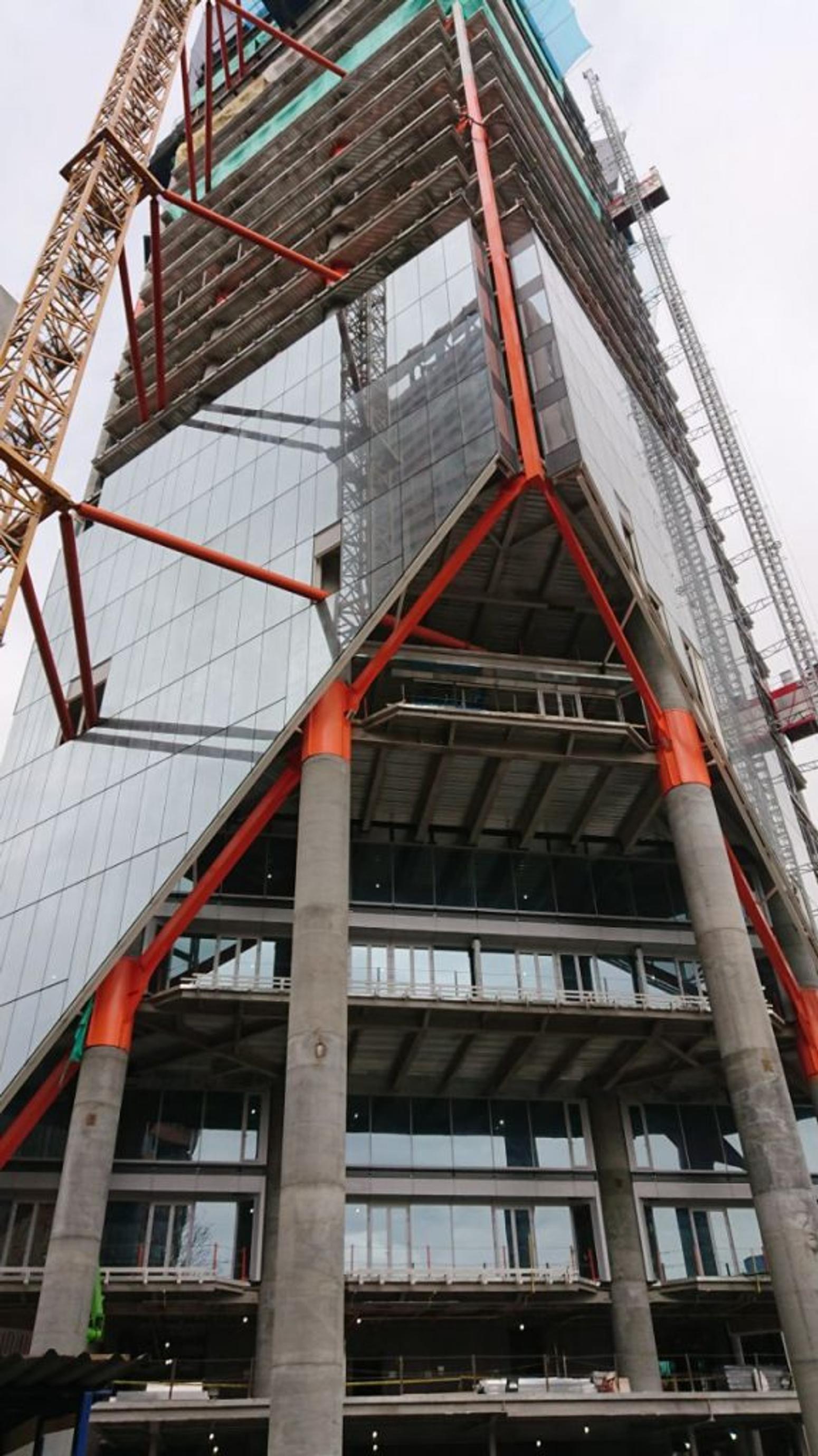 For the North Tower, a top-down construction method was used to reach the raft foundation, at which point workers excavated a ring-shaped perimeter supported by temporary slurry walls. Interior caissons were bored about 230 ft below grade and cast in concrete to support the apron diaphragm ring at each of the five basement levels. Approximately 86,550 cu ft of structural concrete was poured in radial sections until all perimeter walls were cast. This massive concrete pour took place nonstop over a 38hour period and involved numerous engineering and logistical challenges."Careful coordination was essential from prequalifying concrete mixes, to implementing the thermal control plan to guarantee concrete quality, to orchestrating the transport of materials from the supplier's facility to the project site, and more," says Lloyd Keller, construction sciences director at EllisDon.The project also calls for steel-reinforced concrete columns up to 6 ft dia with embedded H sections to transfer gravity forces to the foundations. To reinforce lateral stability, steel bracing painted bright orange tie columns together every second floor.Construction of the North Tower commenced in December 2014 and is anticipated to be completed next May. The North Tower's public space element is on track to wrap up by January 2020. The South Tower is currently in design phases, construction will likely start in 2019 and last approximately three to four years."Working on the iconic ATRIO project has been privilege for EllisDon, allowing us to contribute to transformation of Bogota’s urban landscape," said Jody Becker, SVP Emerging Markets and Chief Strategy Office, EllisDon. "The delivery of this landmark project has enabled us to share our expertise and value-added services within a new international market and to benefit from the knowledge and insights of the local construction community. We are very proud to collaborate with Arpro, our joint-venture partner, and to contribute to infrastructure development in Colombia." Read the full article HERE