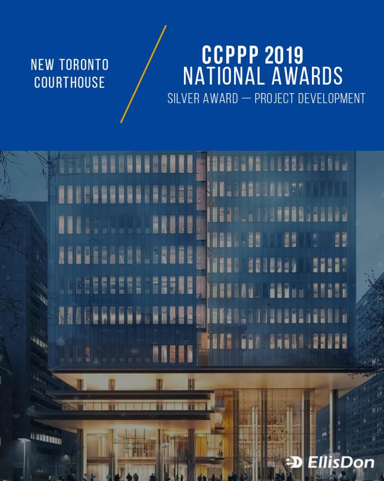 Mississauga, ON, November 4, 2019— Today, The Canadian Council for Public-Private Partnerships (CCPPP) announced the New Toronto Courthouse as the recipient of the Silver Project Development Award for the 2019 National Awards for Innovation and Excellence in P3s.The New Toronto Courthouse is among five award recipients this year. The winning projects all showcase the diversity of projects using P3s to deliver innovative infrastructure that best serves the economic and social needs of Canadians."To be recognized with the CCPPP Development Award for the New Toronto Courthouse is an honour and a testament to the successful collaboration between the partners, setting a new standard for future P3 courthouses in Canada,” says Danny Giacomel, Vice-President, EllisDon Capital. “This partnership brought a unique design perspective to the P3 model and is delivering a landmark in the City of Toronto showcasing its important history and heritage."The partners involved in the New Toronto Courthouse are the Ontario Ministry of the Attorney General, Infrastructure Ontario and EllisDon Infrastructure (with Renzo Piano Building Workshop and NORR Architects & Engineers Limited).The New Toronto Courthouse, currently under construction, will amalgamate six Ontario Court of Justice criminal courthouse locations in one new, accessible location. This P3 project is "noteworthy for its design considerations, as well as its significant stakeholder consultations" to improve access to justice and enhance operational efficiencies as well as commemorating the rich cultural and heritage value of the site,” said the awards committee.Ontario’s first high-rise courthouse, which is set to transform access to the justice system in downtown Toronto, will be honoured with the prestigious award at the CCPPP's 27th annual conference on November 18th at the Sheraton Centre Toronto Hotel. CCPPP’s annual conference is the world’s premier event on public-private partnerships, attracting 1,200 senior public and private sector infrastructure leaders from across Canada and abroad.The Council is a proponent of evidence-based public policy in support of P3s, facilitates the adoption of international best practices, and educates stakeholders and the community on the economic and social benefits of public-private partnerships.The New Toronto Courthouse is slated for completion in 2020.