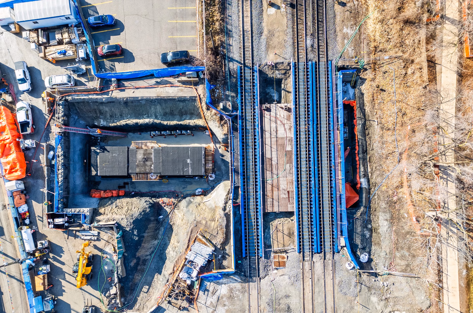 To safely excavate beneath three active tracks, crews installed modular Petrucco steel bridges during two tightly orchestrated track closures. Supported by 36 micropiles, these temporary bridges carried full rail loads, enabling excavation to occur directly below.