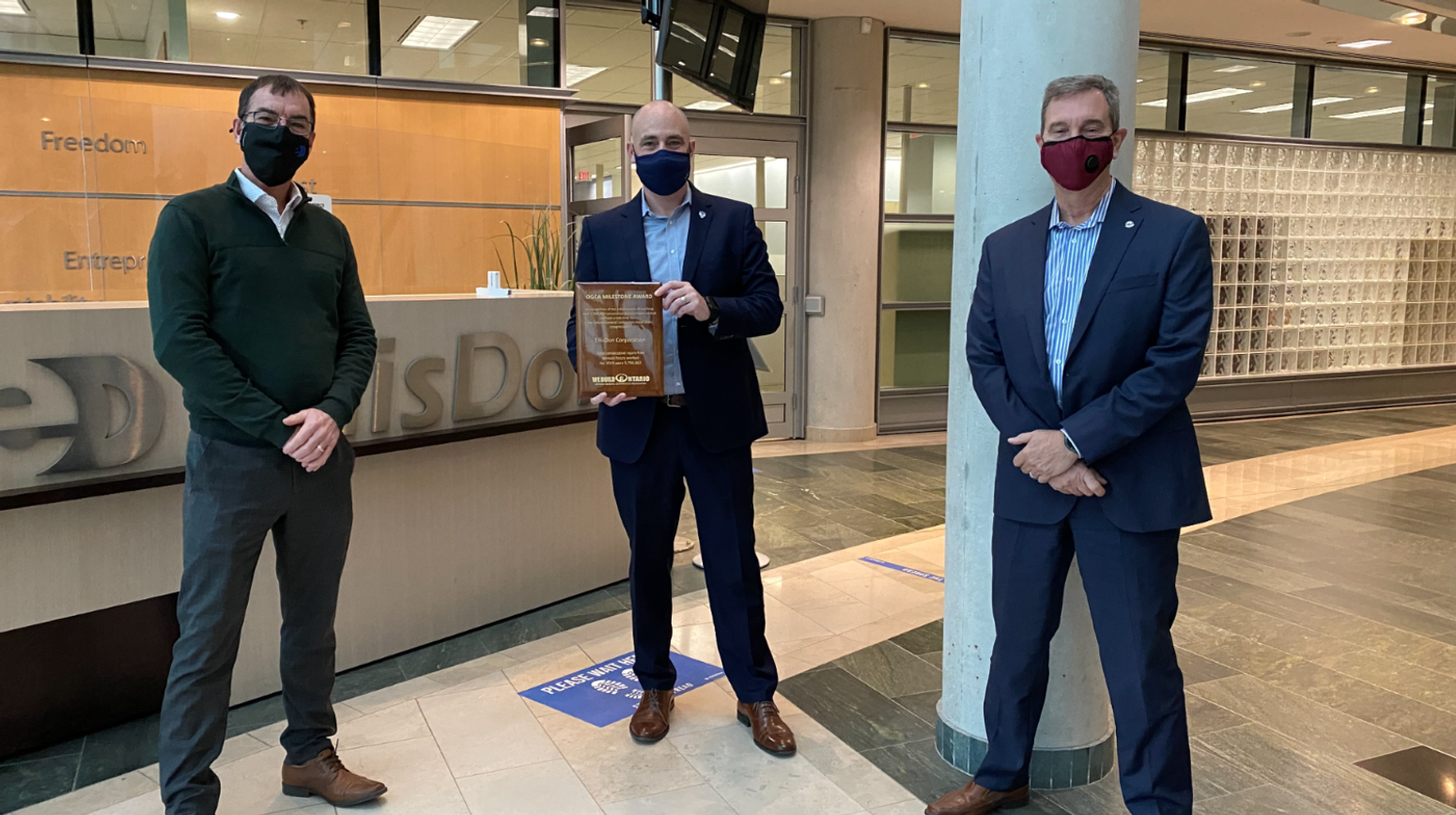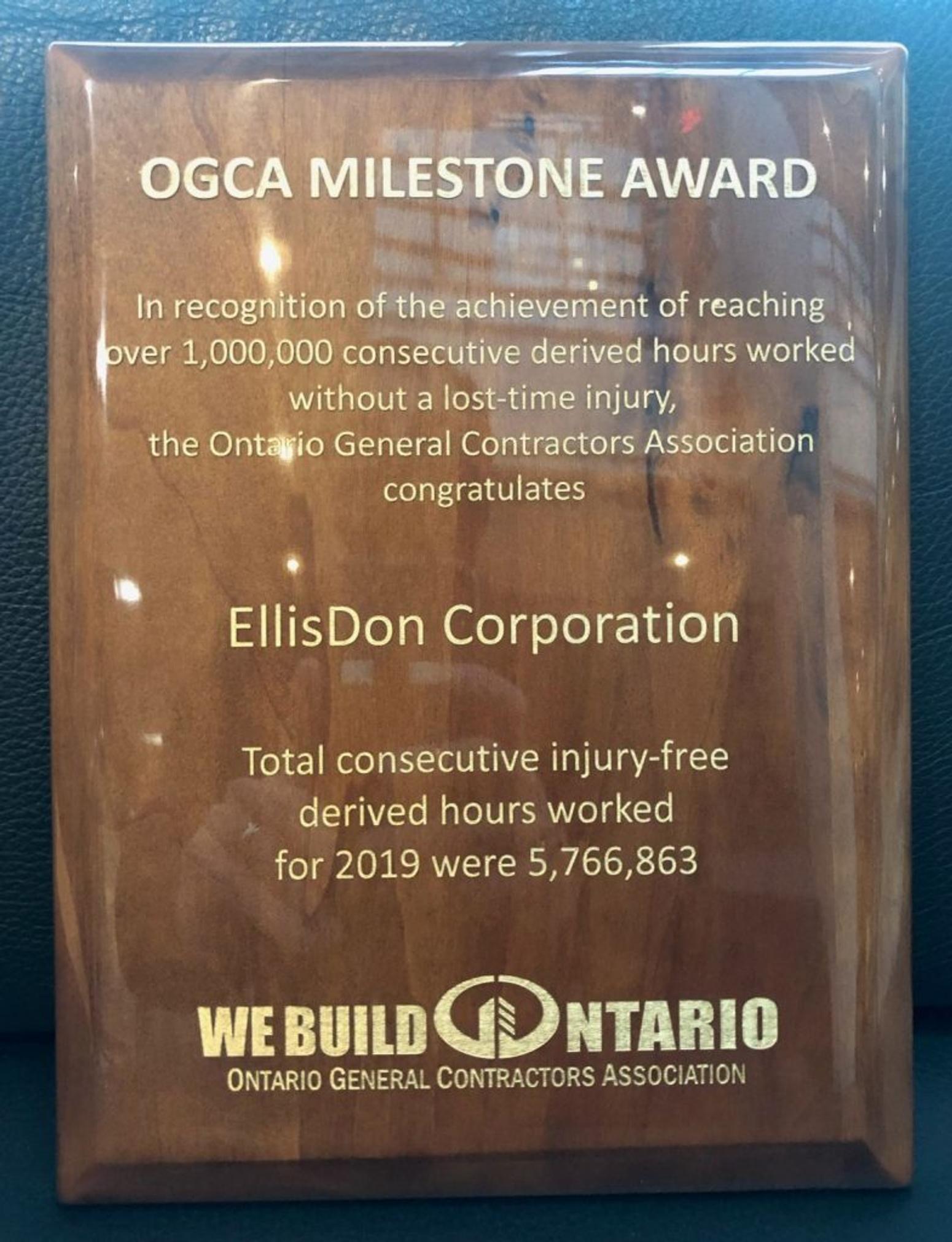 Yesterday, The Ontario General Contractors Association (OGCA) presented EllisDon with the Milestone Award for reaching over 1,000,000 consecutive derived hours worked without a lost-time injury. EllisDon exceeded the award by obtaining well over 6 Million continuous hours without a lost-time injury (LTI).David Frame, Director of Government Relations, OGCA presented the award to John Martin, HSE Regional Director, Toronto Buildings, and Brian Ferguson, Director, Health, Safety & Environment, Civil Division.Thank you to the Ontario General Contractors Association for this recognition!