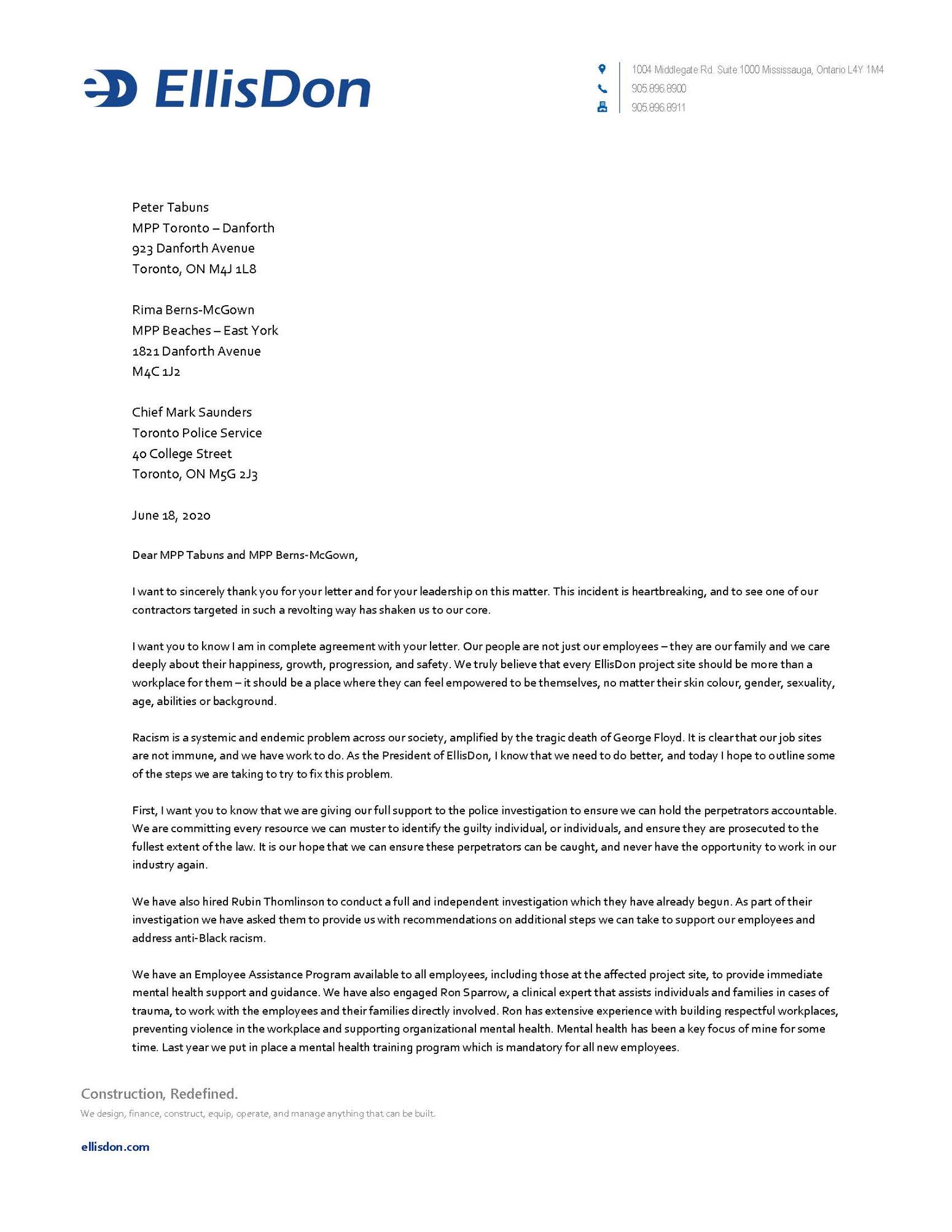Toronto, ON M5G 2J3June 18, 2020Dear MPP Tabuns and MPP Berns-McGown,I want to sincerely thank you for your letter and for your leadership on this matter. This incident is heartbreaking, and to see one of our contractors targeted in such a revolting way has shaken us to our core.I want you to know I am in complete agreement with your letter. Our people are not just our employees – they are our family and we care deeply about their happiness, growth, progression, and safety. We truly believe that every EllisDon project site should be more than a workplace for them – it should be a place where they can feel empowered to be themselves, no matter their skin colour, gender, sexuality, age, abilities or background.Racism is a systemic and endemic problem across our society, amplified by the tragic death of George Floyd. It is clear that our job sites are not immune, and we have work to do. As the President of EllisDon, I know that we need to do better, and today I hope to outline some of the steps we are taking to try to fix this problem.First, I want you to know that we are giving our full support to the police investigation to ensure we can hold the perpetrators accountable. We are committing every resource we can muster to identify the guilty individual, or individuals, and ensure they are prosecuted to the fullest extent of the law. It is our hope that we can ensure these perpetrators can be caught, and never have the opportunity to work in our industry again.We have also hired Rubin Thomlinson to conduct a full and independent investigation which they have already begun. As part of their investigation we have asked them to provide us with recommendations on additional steps we can take to support our employees and address anti-Black racism.We have an Employee Assistance Program available to all employees, including those at the affected project site, to provide immediate mental health support and guidance. We have also engaged Ron Sparrow, a clinical expert that assists individuals and families in cases of trauma, to work with the employees and their families directly involved. Ron has extensive experience with building respectful workplaces, preventing violence in the workplace and supporting organizational mental health. Mental health has been a key focus of mine for some time. Last year we put in place a mental health training program which is mandatory for all new employees.We have also developed an Inclusive Diversity training program that all employees must also undertake on identity, perspective, language and inclusive environments before beginning their work with us. Inclusive leadership is a key performance indicator through our Performance Review process to ensure we are empowering the right talent at our company.In addition to this, we have created an internal anti-racism group to discuss next steps for developing a company-wide action plan that will make our job sites safer and more inclusive for our Black and racialized employees. As part of that work, we are exploring partnerships with organizations who support the Black community and are in the process of reviewing potential partners as we speak. I have also engaged in conversations about combatting racism at our Board level to ensure this is the highest priority for our leadership team.To reinforce the importance of anti-racism within our organization we have posted a company-wide portal message to all employees and additional communication has been had with senior leaders at EllisDon. For the last two years, we have run an Employee Education and Awareness Campaign on inclusion and diversity and this month we have focused explicitly on racism, privilege, mental health, allyship and bias. Approximately twenty educational resources have been shared with our employees this month and we have another thirty slated for release over the coming days and weeks.We know that we also need to be holding ourselves accountable for diversity as a company. That is why we have committed to regularly measuring and being transparent about the progress made on our demographics through a confidential collection of how our employees identify in factors like ethnicity, Indigenous status, sexual orientation, veteran status, and physical ability. We are also currently improving our strategies for attracting a more diverse and inclusive candidate pool by partnering with organizations and debiasing our job descriptions.Finally, we also understand how incredibly important it is to hear directly from our employees to make improvements that are responsive to their needs and concerns. We are in close contact with our employees and will continue to communicate openly and transparently with them to find ways we can make our job sites even safer.I want to assure you that we meant what we said in our public statement – to say we are shocked and disgusted by what happened is an understatement. The reality is that leadership comes from the top down and I am completely committed to doing everything I can to support people of colour within our company.I would also ask that you maintain open lines of communication with me. Your experience and knowledge are significant, and I would greatly appreciate any feedback or advice you might have on how we can further improve our operations.I thank you again for your leadership on this matter and look forward to working with you in the future.Sincerely,Geoff Smith