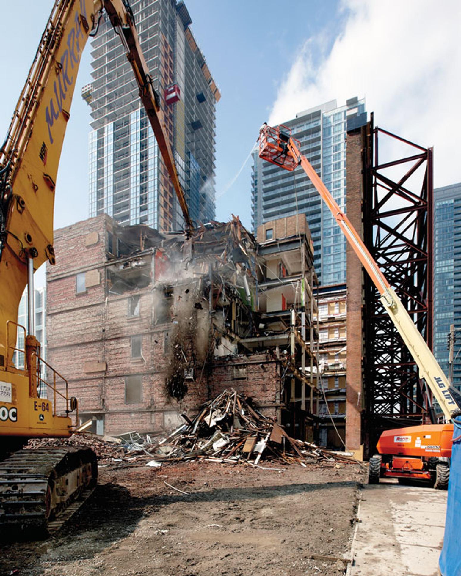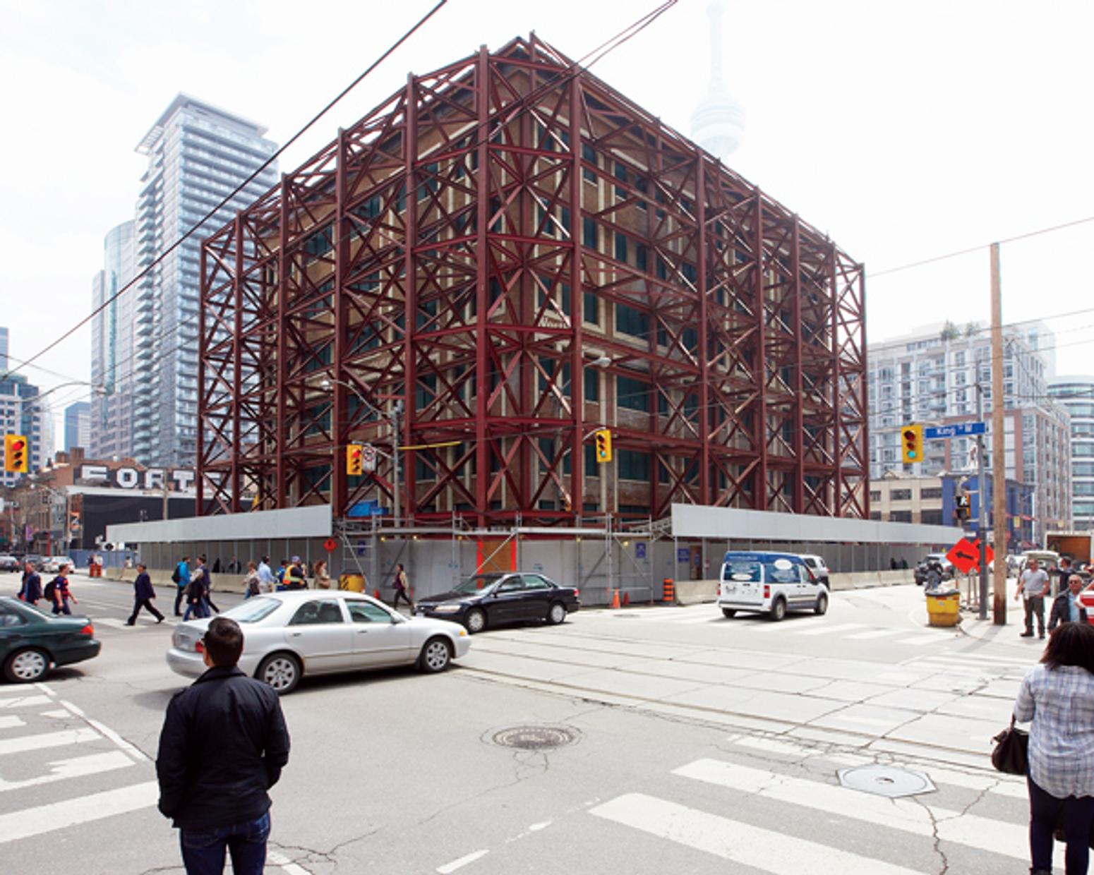 After the demolition was completed in June 2016, the next phase was the excavation and construction of the garage — which reached grade level by June 2017. That was followed by the construction of the podium.“The slabs were tied into the heritage wall beginning at the first suspended level.”By last November the construction of the podium had reached the stage where the steel trusses along Blue Jays Way could be taken down, with the ones on King Street removed at the end of March, says Christian.Preserving the heritage façade, which “floated” over the garage excavation, and then reconnecting it to the podium has been the most challenging phase of the entire project, he says.Now fully tied into the podium, the non-bearing heritage wall has the ability to independently expand and contract which helps preserve its integrity and appearance, says Jablonsky AST’s Henry Song.