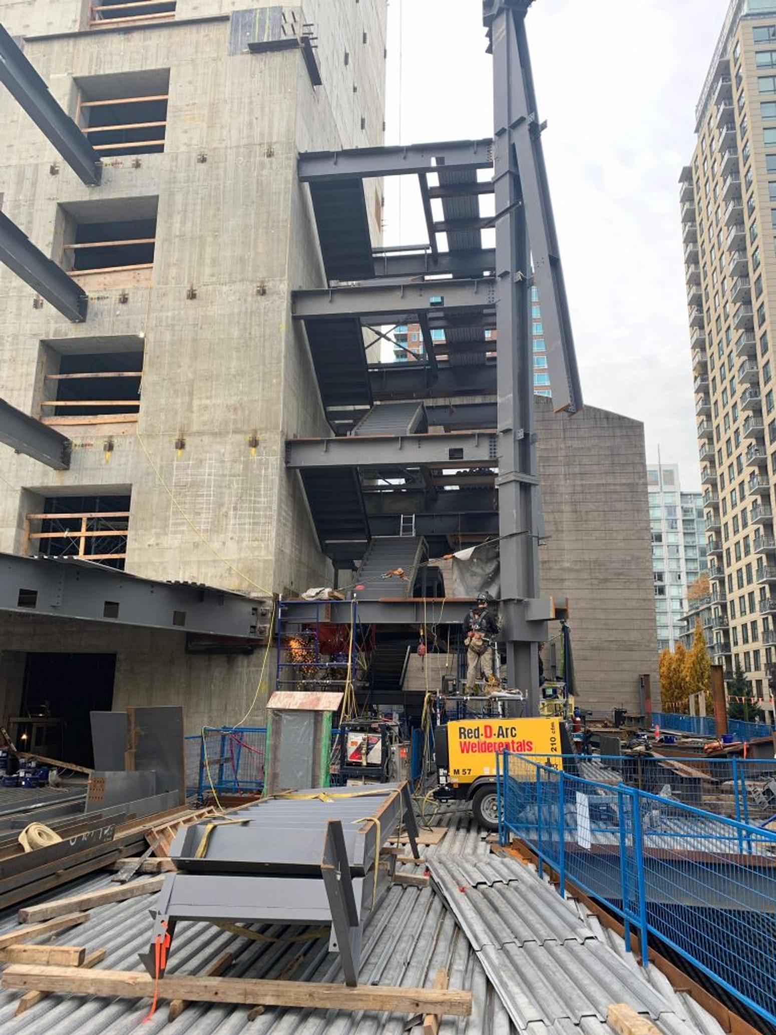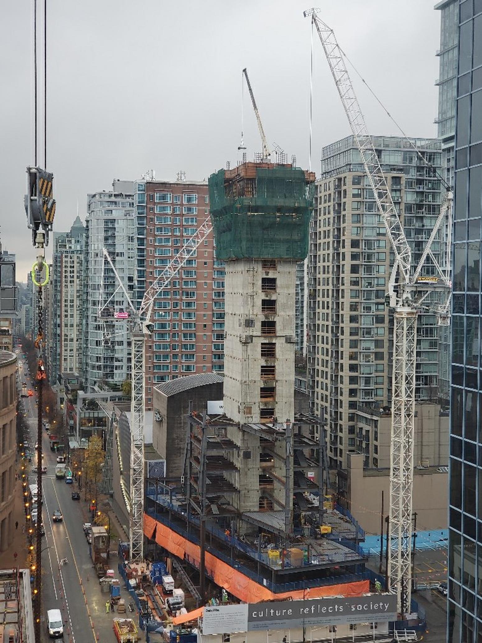As construction continues on the 400 West Georgia project, it’s eye-catching cube design is starting to take shape.The distinctive design by Canadian firm Merrick Architecture, is inspired by a Japanese noguchi lamp, featuring offset cubes sprouting from a central stem. The building will consist of a circular concrete core with structural steel beams and steel decking, effectively forming a cogwheel of boxes.Each four-storey cube consists of a triple-paned curtain wall, openable windows, large spans of column-free space, and glass floors.