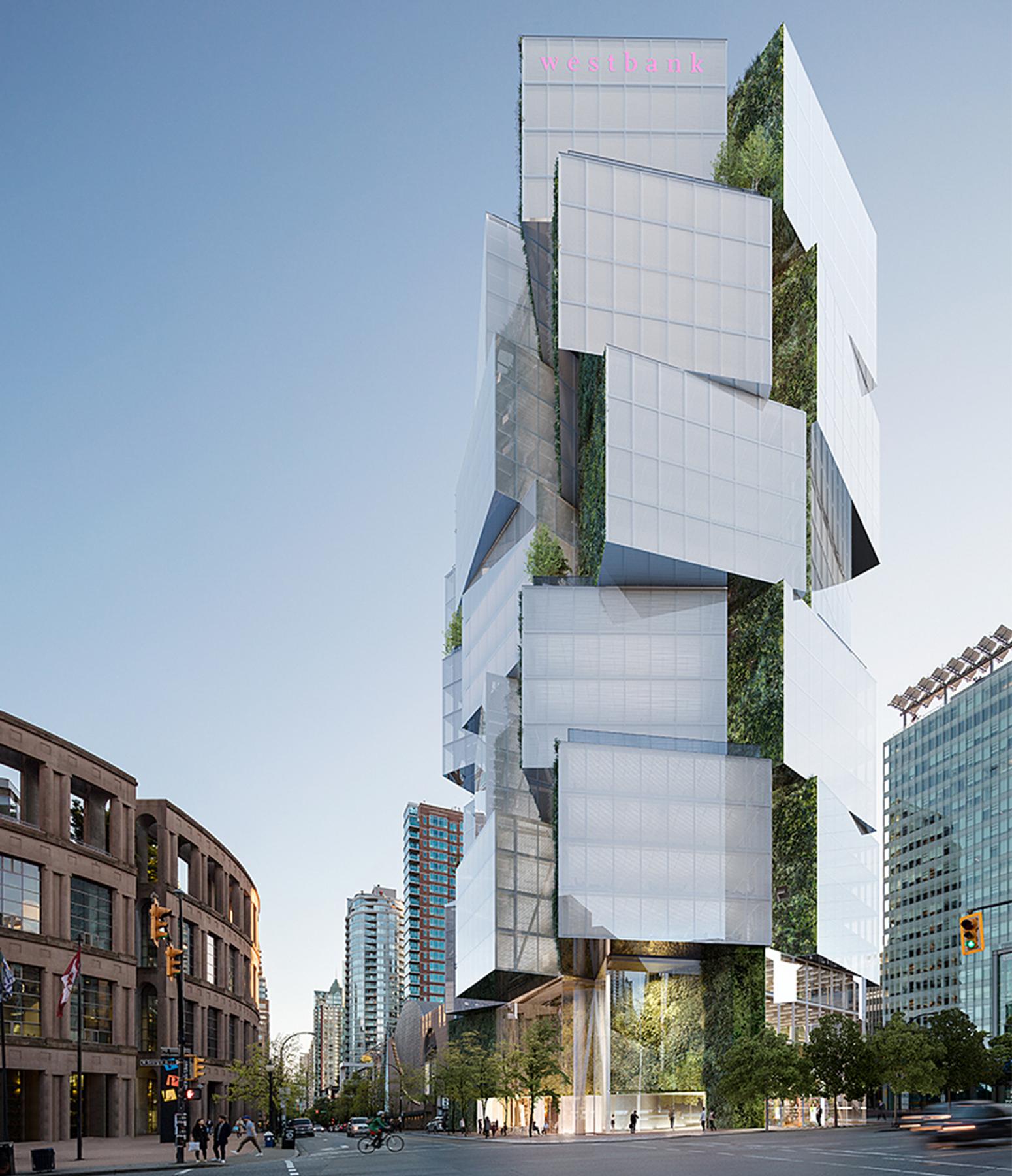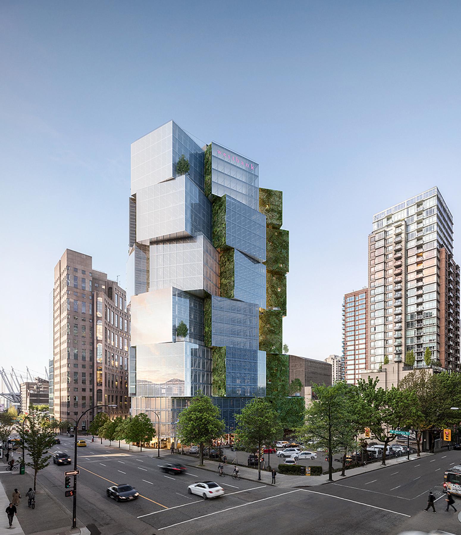 Designed by Merrick Architecture, the cube design is inspired by a Japanese Noguchi lamp. To achieve the design, the building consists of a concrete core supporting vertical steel columns, structural steel beams, and steel decking, effectively forming a cogwheel of boxes. Each cube has four-storeys, triple-pane curtain wall, openable windows, wide column-free spaces, and glass floors. Hydroponic living walls with greenery and water elements adorn the area between each cube. Tenants also have access to a garden and amenity space on the roof.