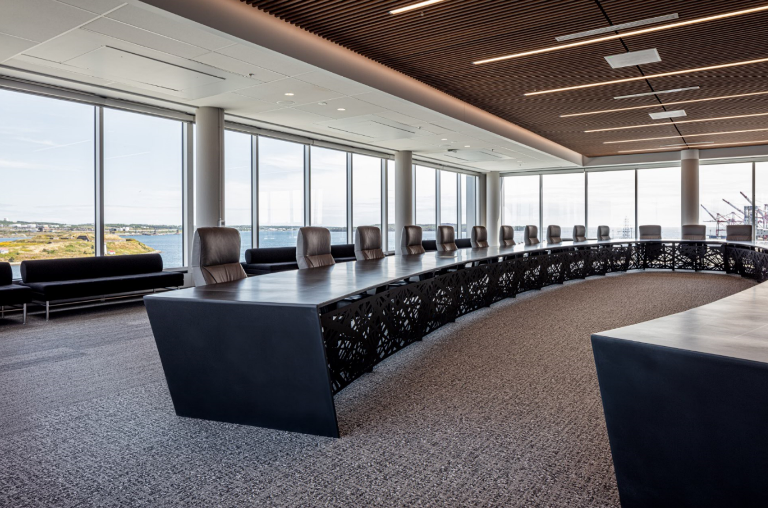The building at 5151 Terminal Road consisted of an eight-storey office tower with one level of underground parking, originally built in the early 1980’s. The renovation and refurbishment of the 158,000 sq. ft. building included the replacement of glazing and spandrel panels, as well as the installation of new roofing and roof top terraces. The building also underwent environmental abatement prior to selective demolition of the interior spaces. The three elevators were modernized, and the electrical, plumbing, and fire protection systems were upgraded. Electrical upgrades included rooftop photo-voltaic panels and ‘smart building’ technology. The HVAC system was replaced and installed to incorporate a seawater cooling system. As part of the project, a new pedestrian pedway linking 5151 Terminal Road to 1223 Lower Water Street uses seawater from Halifax harbour, required for the new cooling system. The renovation to the interior spaces included an enhanced two-storey lobby, and an executive-grade floor on level eight. Floors two to seven were fit-up with modular furniture office spaces.