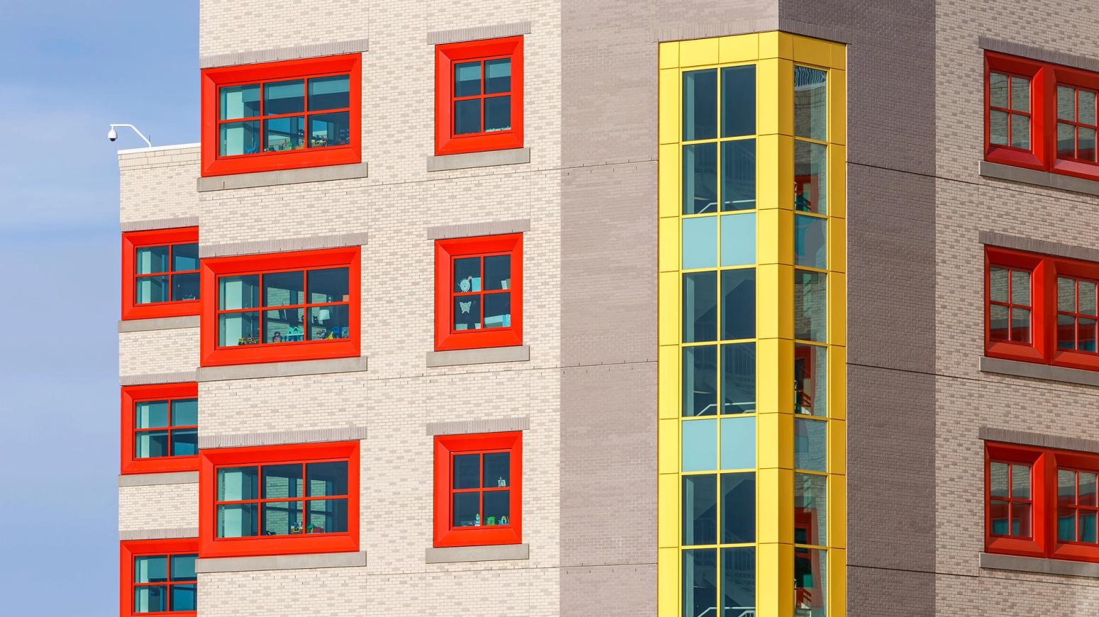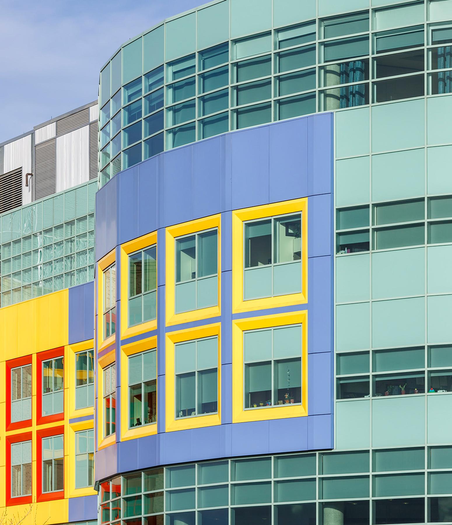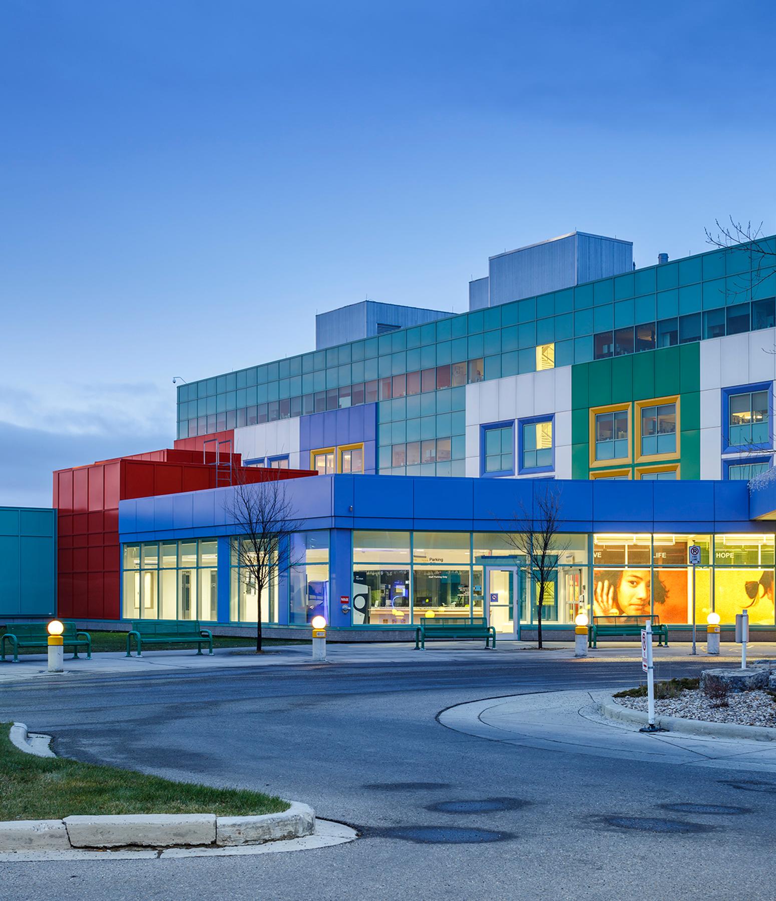 The whimsical children’s building blocks that make up the exterior design of the hospital were inspired by the input the caregivers and children who submitted drawings of a two storey structure with bright coloured windows, including green, yellow, red and periwinkle blue.