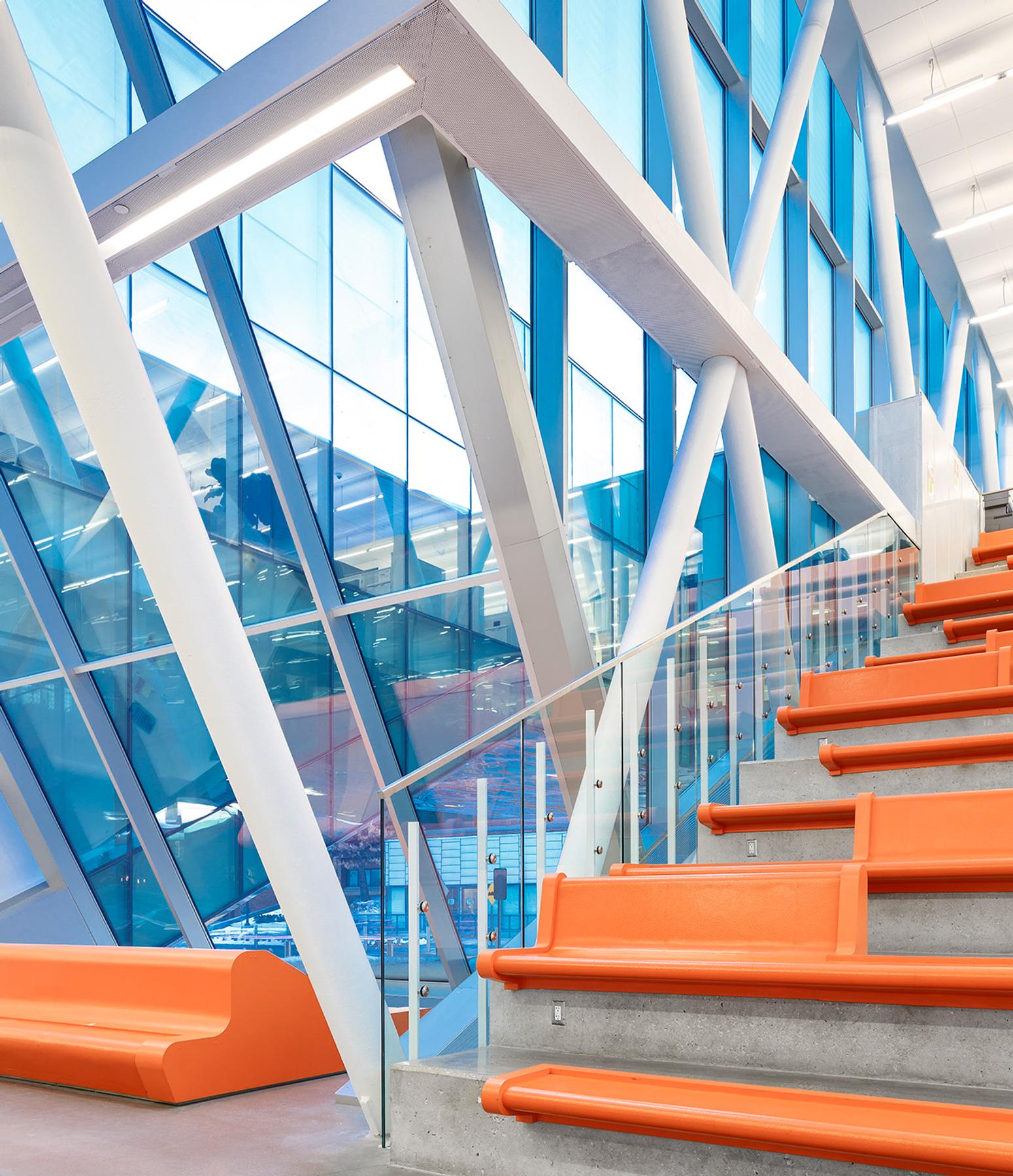 Creative collaboration with daring teams gives you projects like Centennial College’s Ashtonbee Campus. The campus uses a unique curtain wall design that makes the building shimmer pleasantly in daylight and glow warmly at dusk.