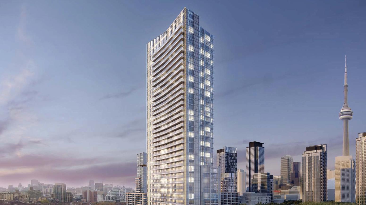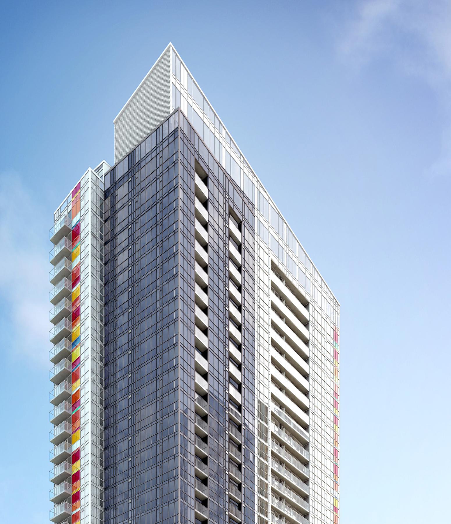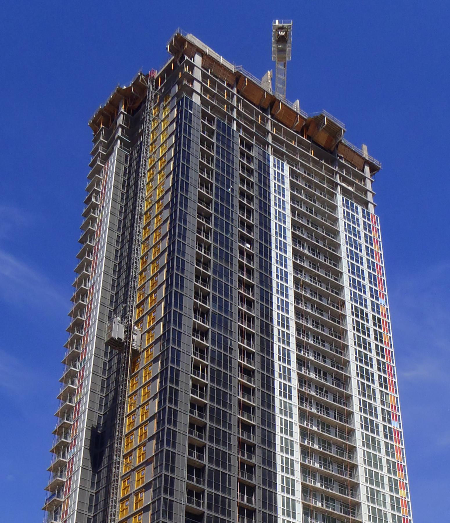 Construction materials include high rise window wall, with some precast elements and metal/aluminum cladding. The mechanical features include air handling units for the corridors and fan coils with energy recovery ventilator units for each suite. The site borders a heritage warehouse and the Gardiner Expressway, which created construction challenges. The site is also located just above lake level, which causes ground water problems during excavation.
