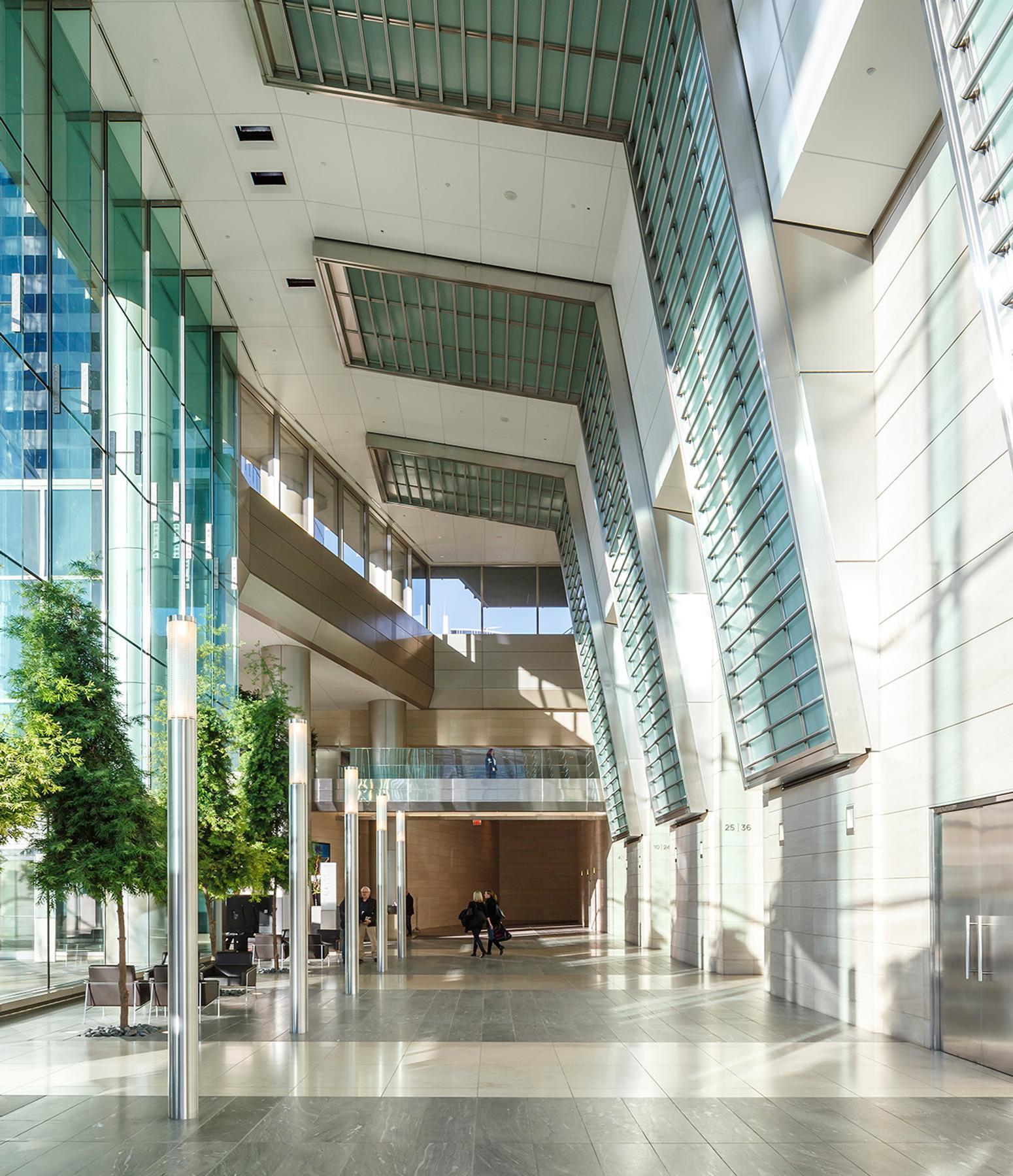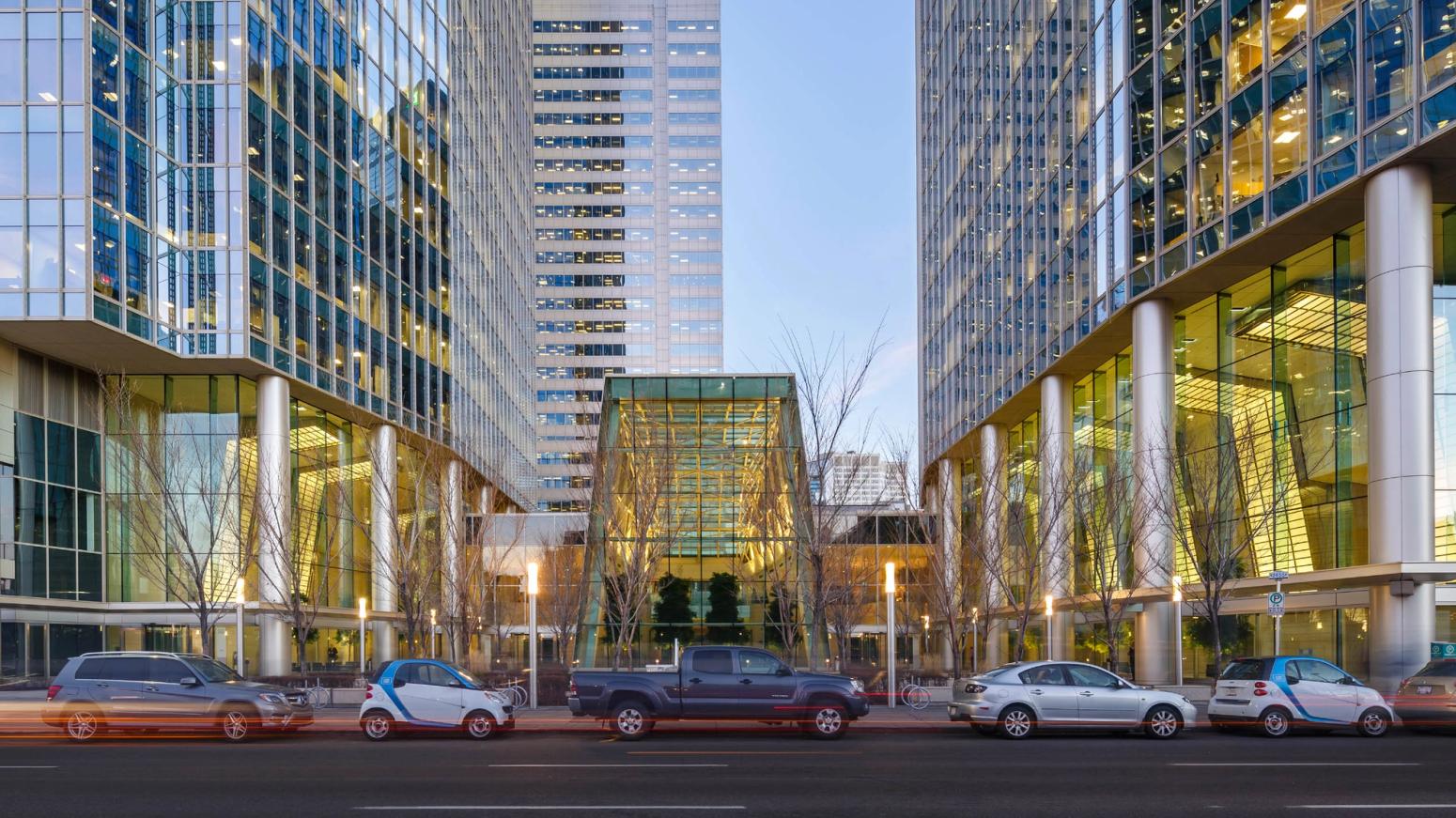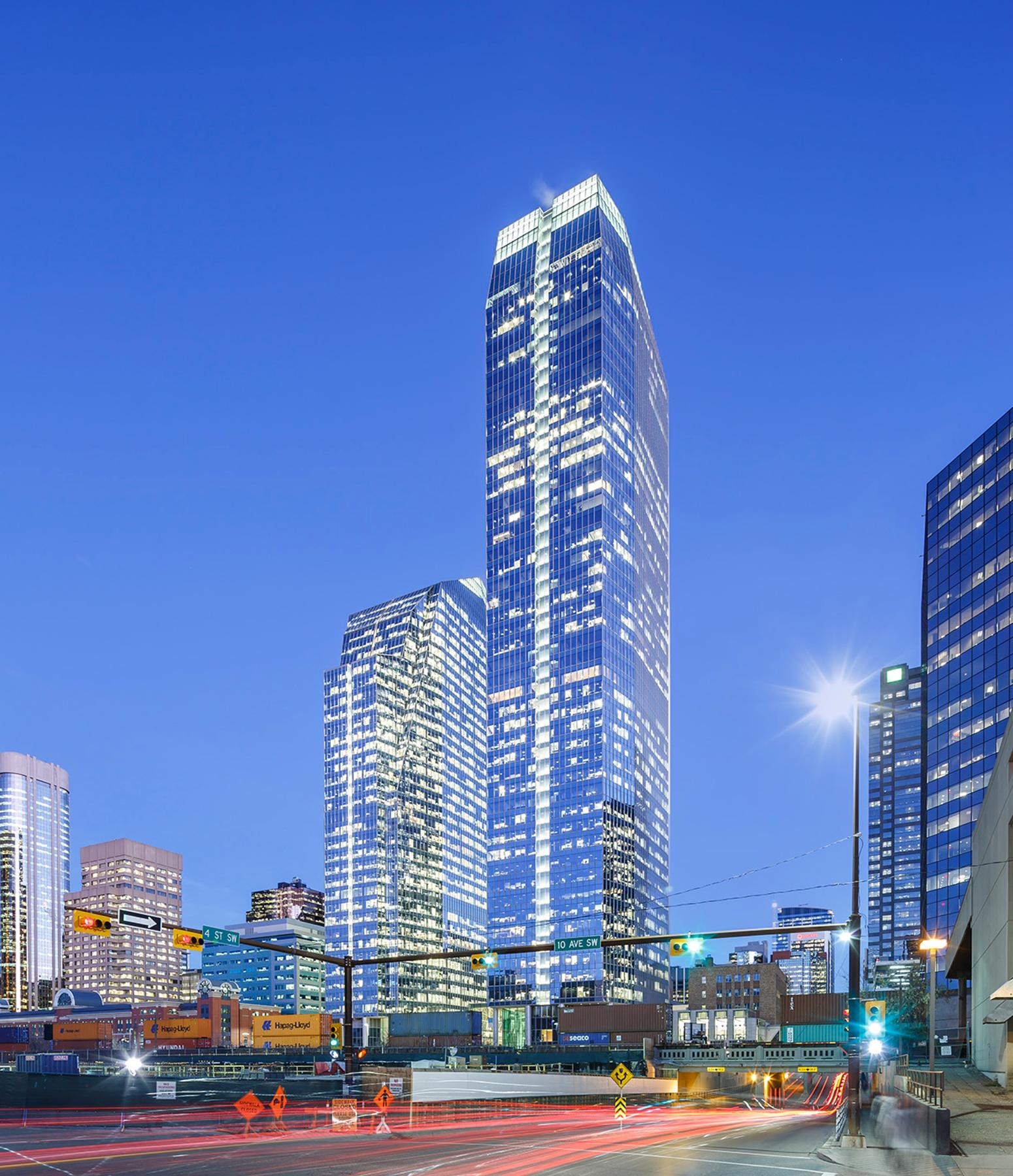 The west tower is a new 40-storey 850,000 square foot tower in downtown Calgary. A new three-storey lobby will connects the new tower to the existing east tower and winter garden. The new tower is situated diagonally across from the existing tower on the site, and will be sloped in the opposite direction from the existing tower, maximizing tower views for occupants of both towers.