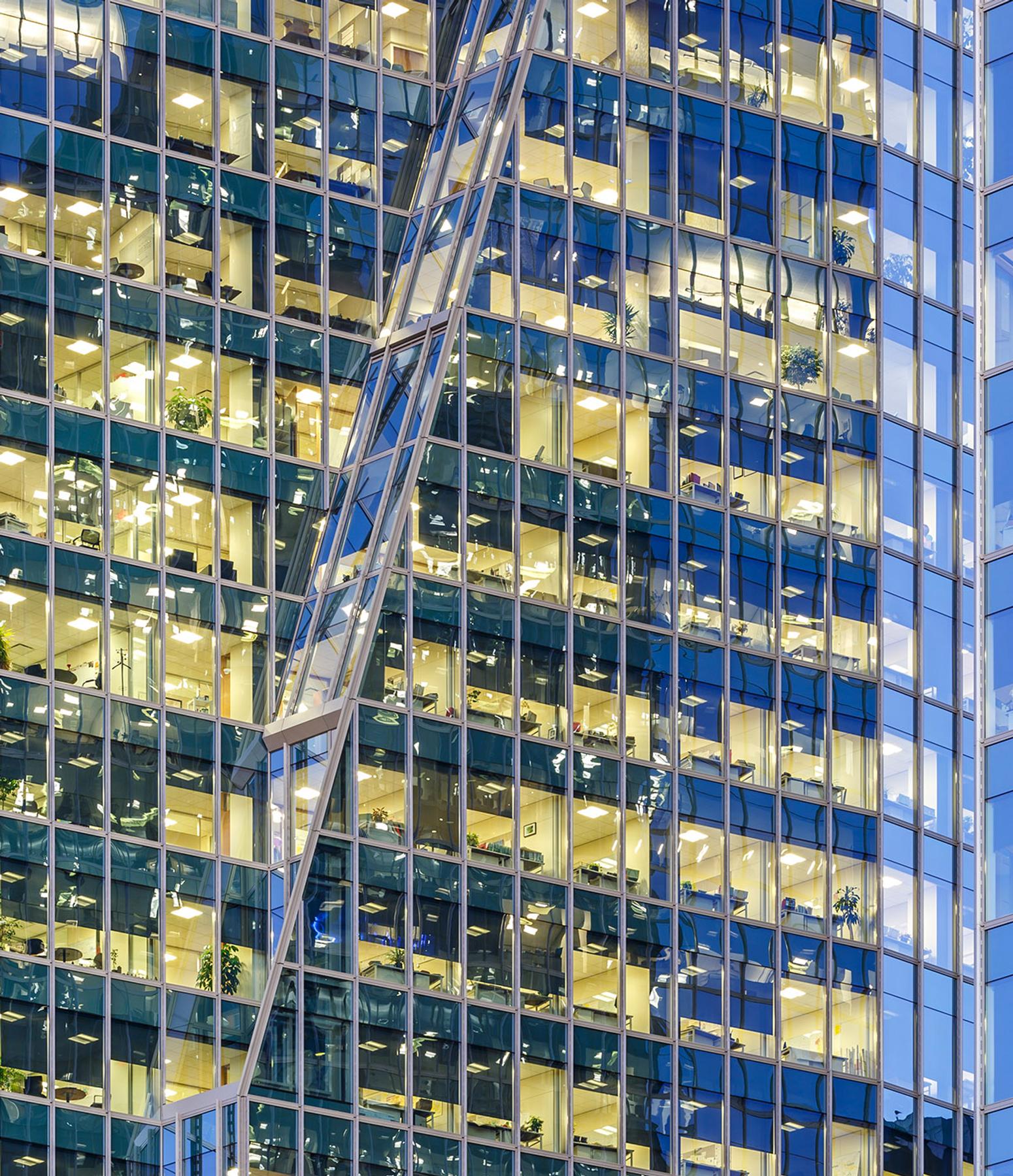 Architectural crown lighting, as well as vertical light features, are incorporated into the exterior design, creating a striking effect at night. Each floor plate is approximately 22,000 square feet of Class AAA office space with floor to ceiling windows. The new tower is built on top of an existing two-storey podium and six-storey underground parkade, which was open for operation during construction.