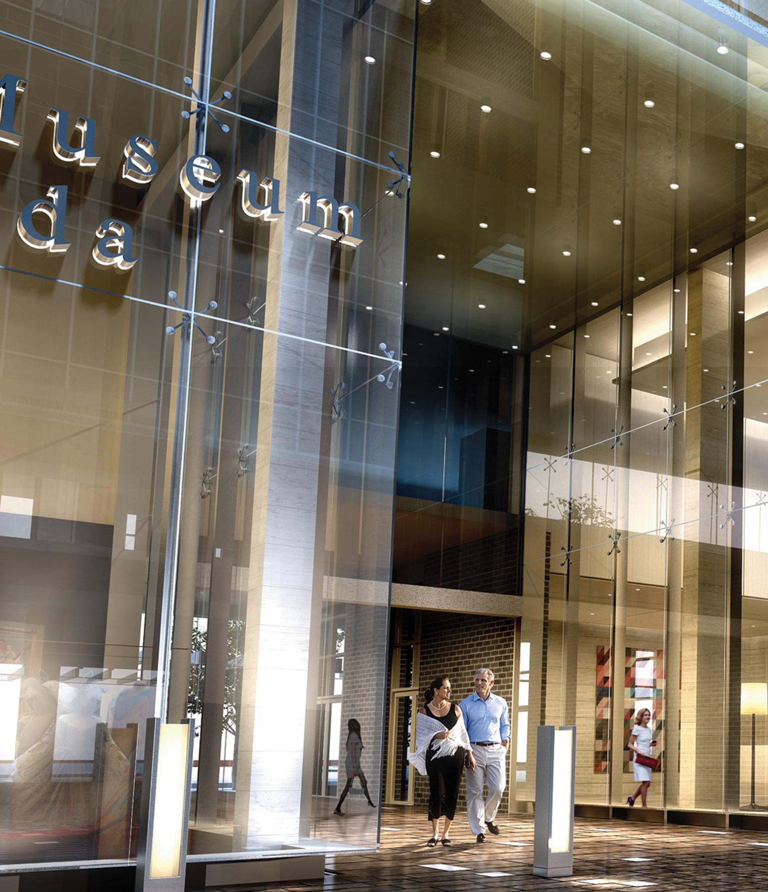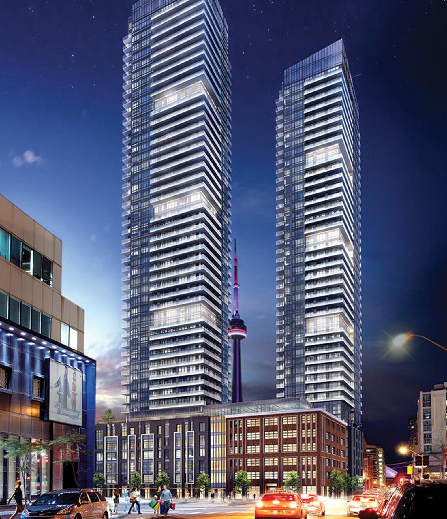 As part of the development, the historic Westinghouse building was partly demolished. However, its six-storey façade was maintained and integrated into the podium, which includes a 121-room hotel. The ground floor includes public space with incorporated retail shops. Brick from the original building was reclaimed and installed as part of the exterior design. The building structure uses reinforced concrete and the excavation is supported by the caisson wall, and piles, with lagging. The majority of the façade is a window wall system but also includes brick, curtainwall, and precast. The development has a total area of approximately 710,000 sq. ft. with 600,000 sq. ft. for residential use, 100,000 sq. ft. for the hotel and 10,000 sq. ft. for non-residential use.