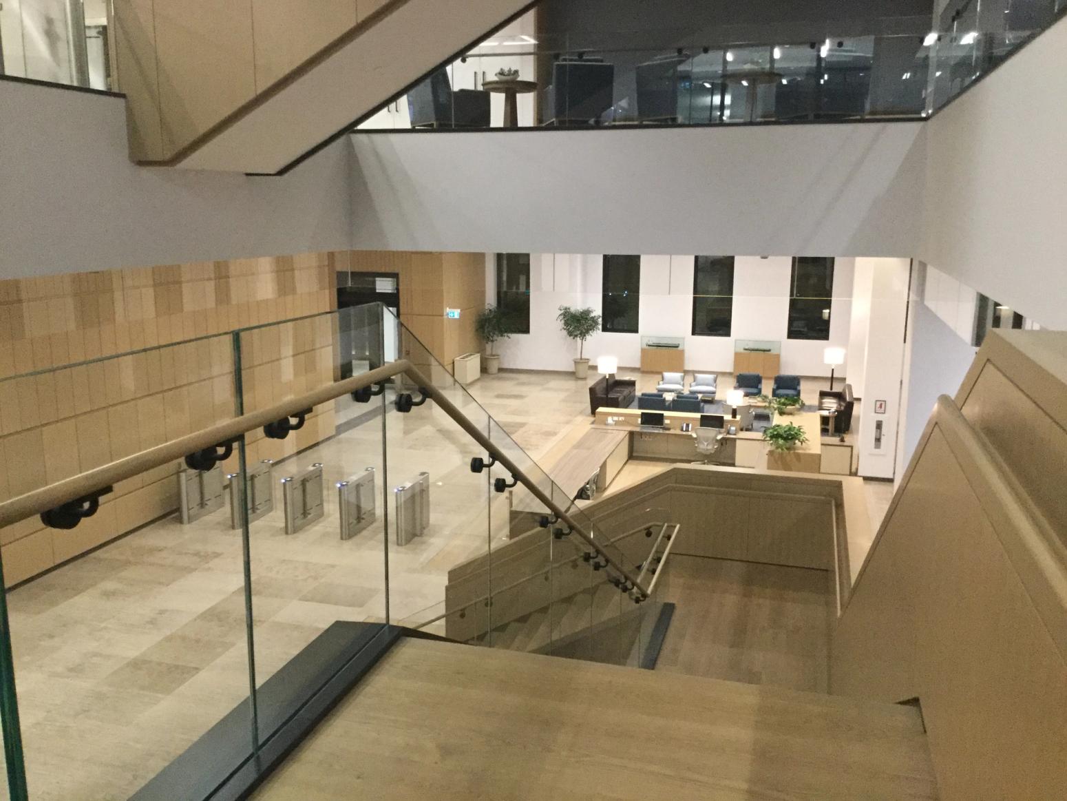 Connection to the outdoors is a main element of the project, featuring a roof skylight on the 11th floor, to flood the space with natural light, and an outdoor terrace on the 5th floor, featuring reflective precast pavers and glass guardrails, allowing direct outdoor access for employees. The building is targeting LEED certification.