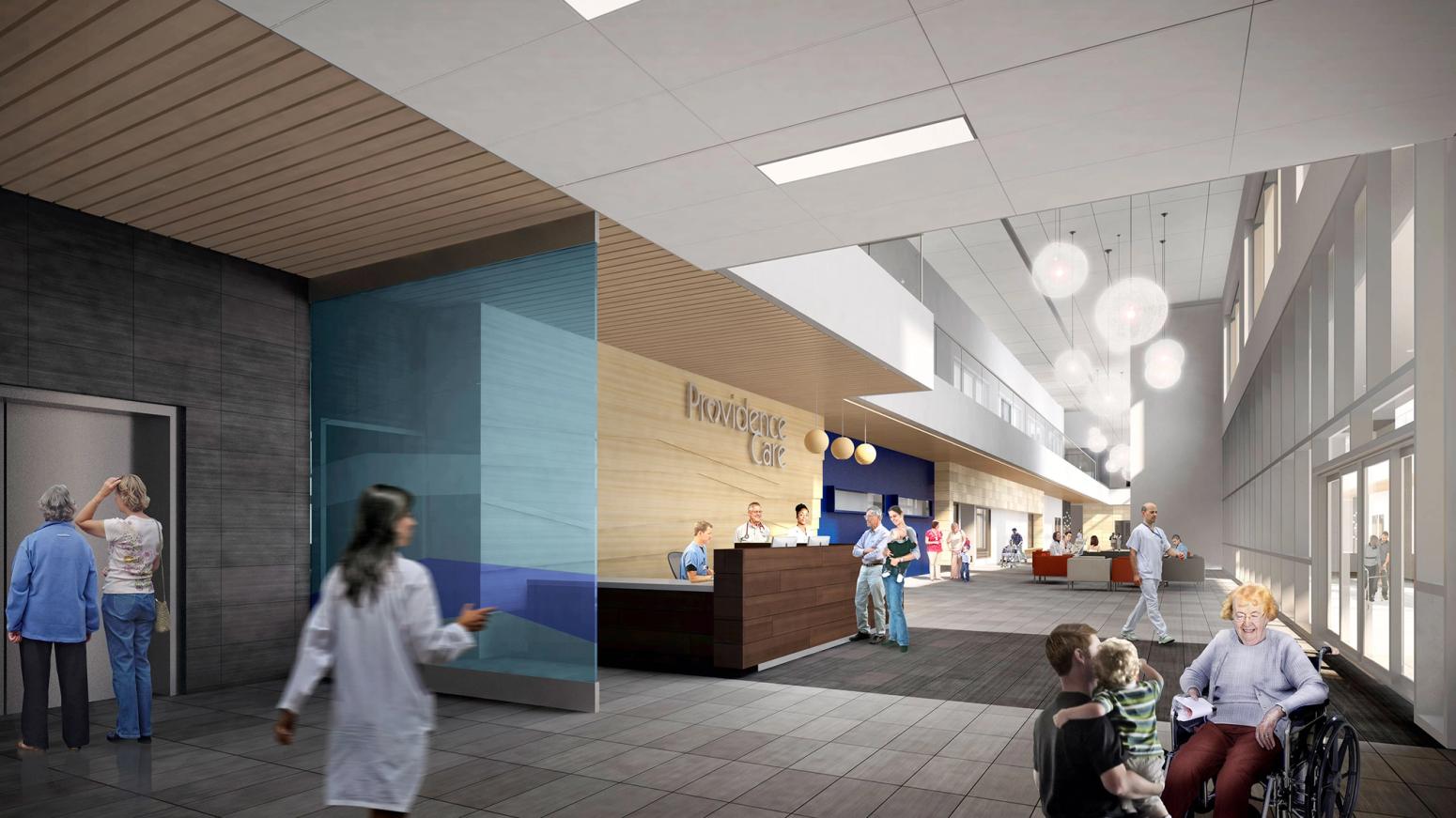 Providence Care Hospital patient and visitor amenities include quiet rooms, family lounges, kitchenettes and dining areas. The rehabilitation gym includes a walking track, therapy equipment and a therapy pool. Also included are areas for religious services and community gatherings, a lecture hall, cafeteria, gift shop, research support facilities, and an administration area. The exterior works include multiple outdoor courtyards, gardens and terraces that will provide patients with a comfortable area to gather with family and friends.