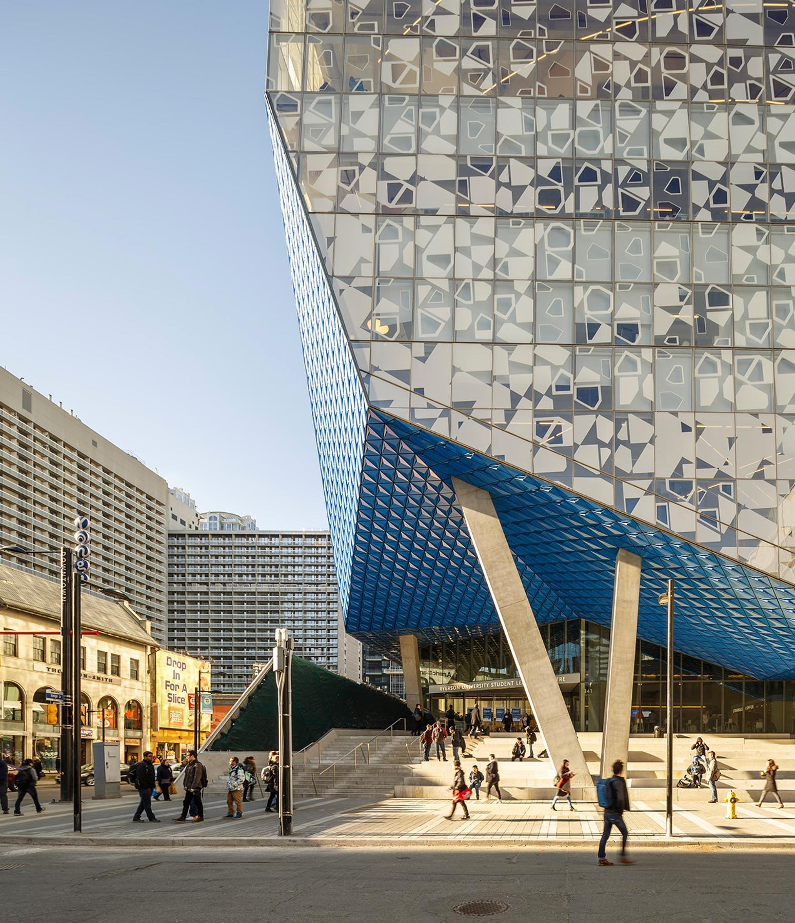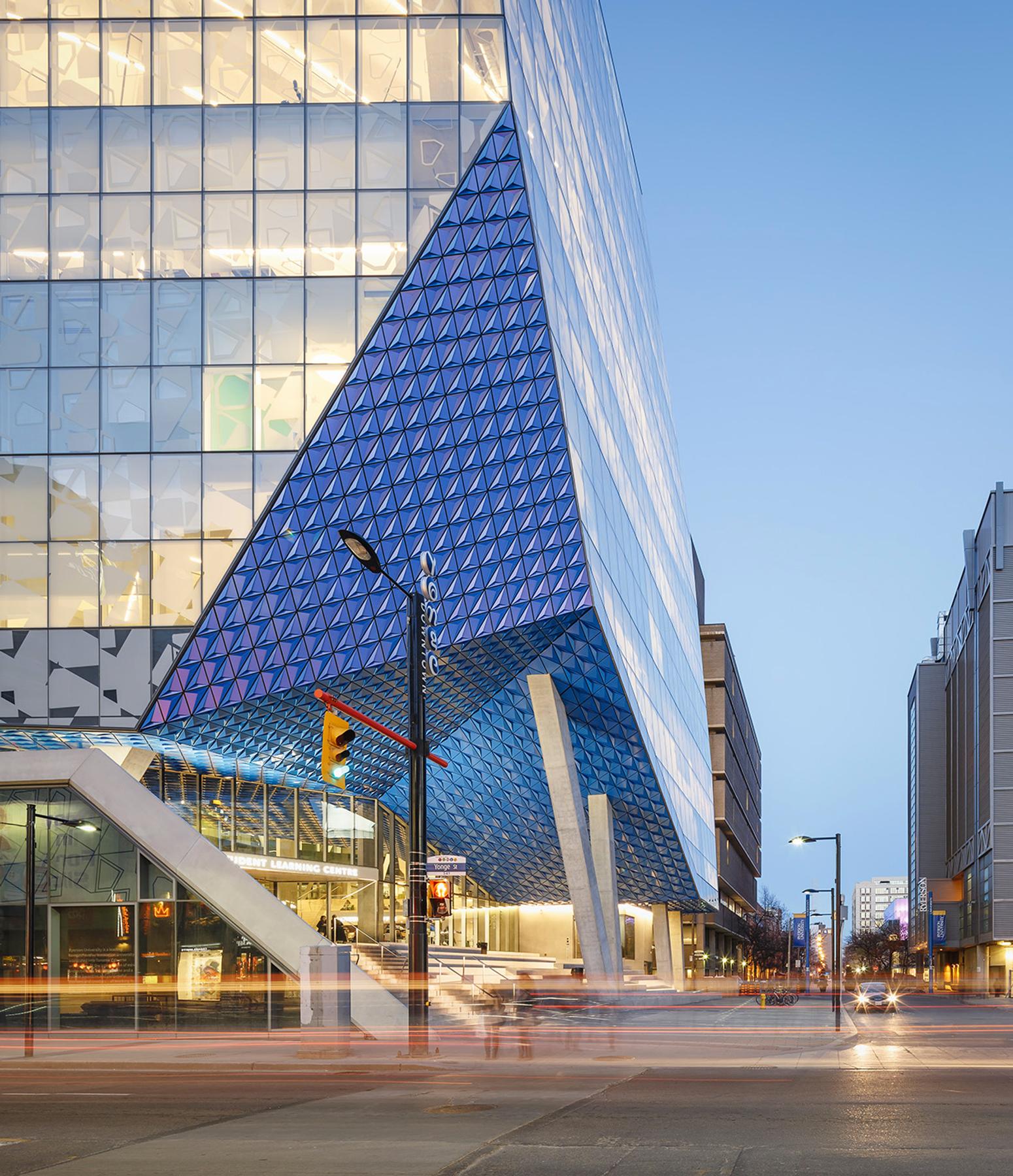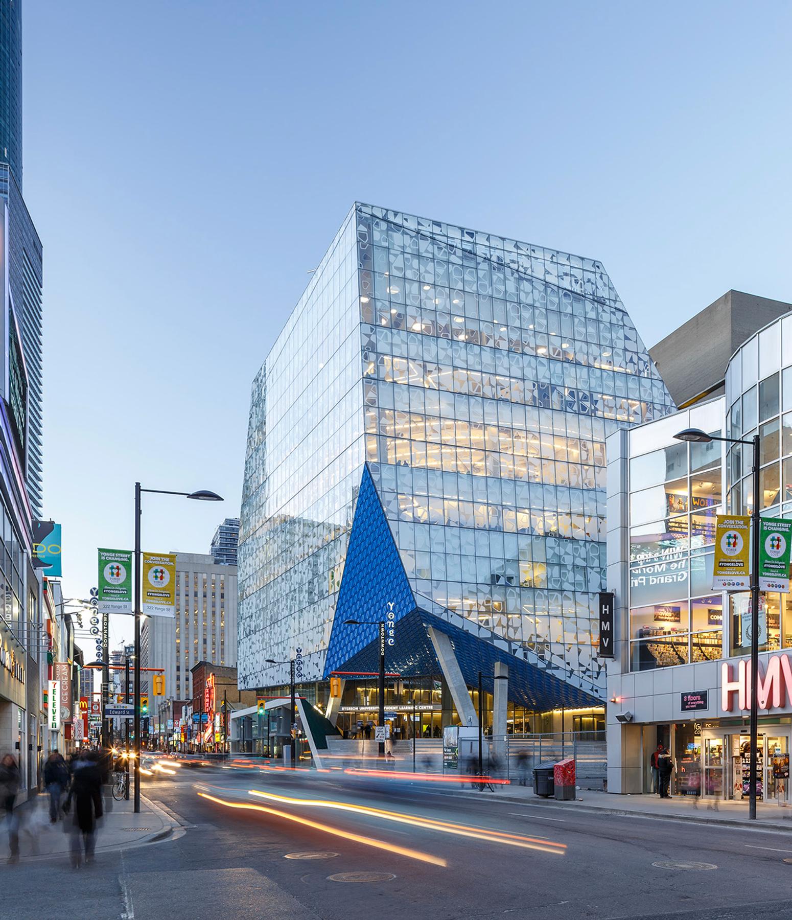 The new Ryerson Student Learning Centre is situated at the bustling corner of Yonge and Gould Streets in Toronto. This 156,000 square foot, nine-storey building showcases an impressive glass facade, including an elevated plaza and bridge connecting to the existing library. The ground floor and basement features prominent commercial retail space facing outwards onto Yonge Street with a transparent glass skin that creates a variety of lighting throughout the building. The facility is barrier free, which encourages a place of social interaction and engagement. It contains student learning centres, labs, and study areas.