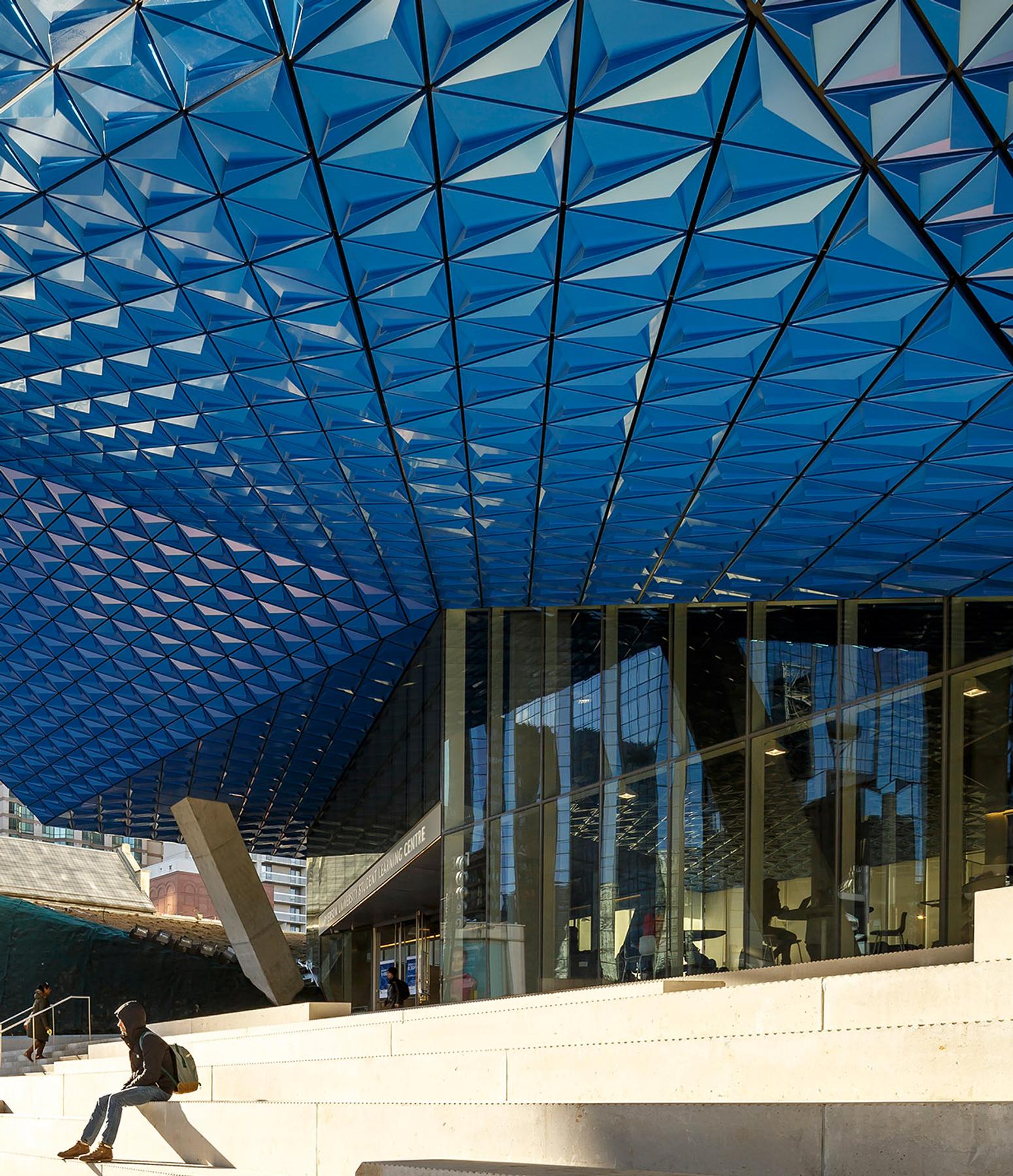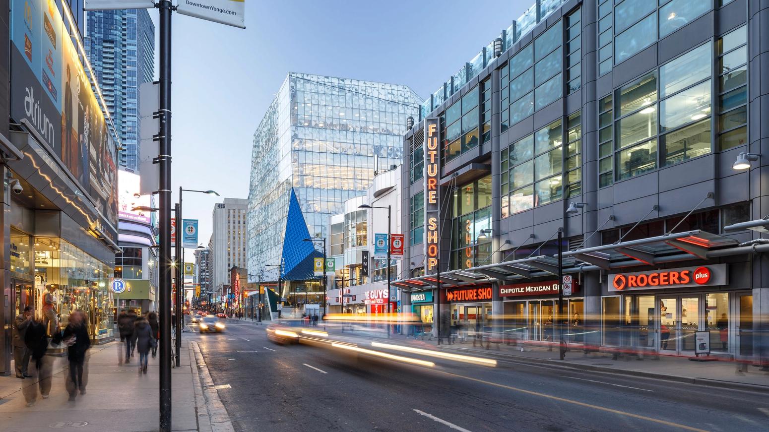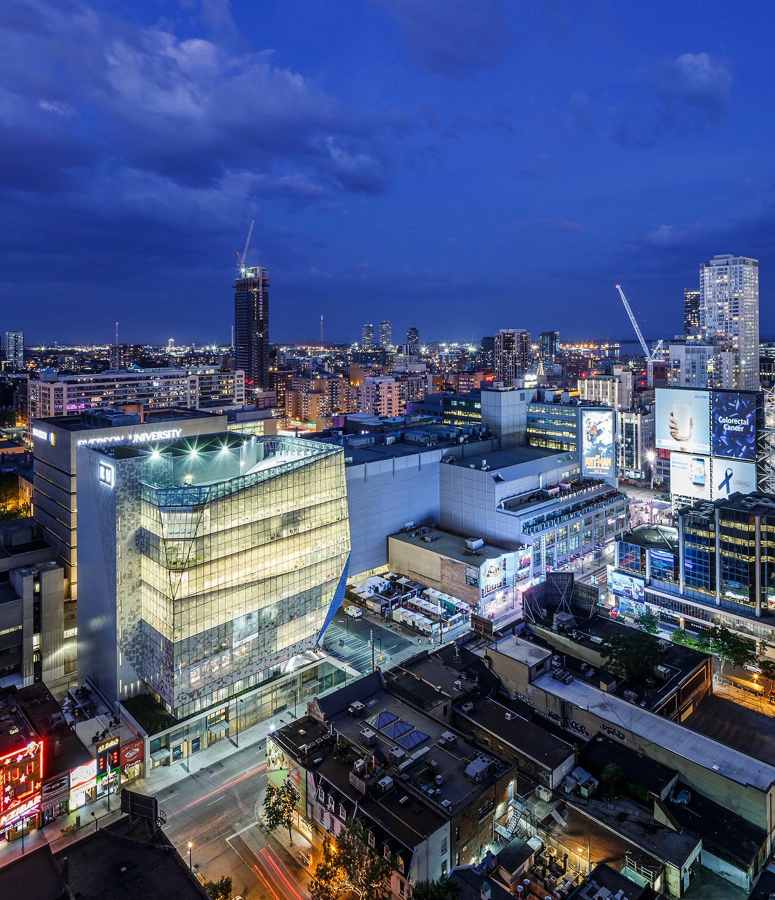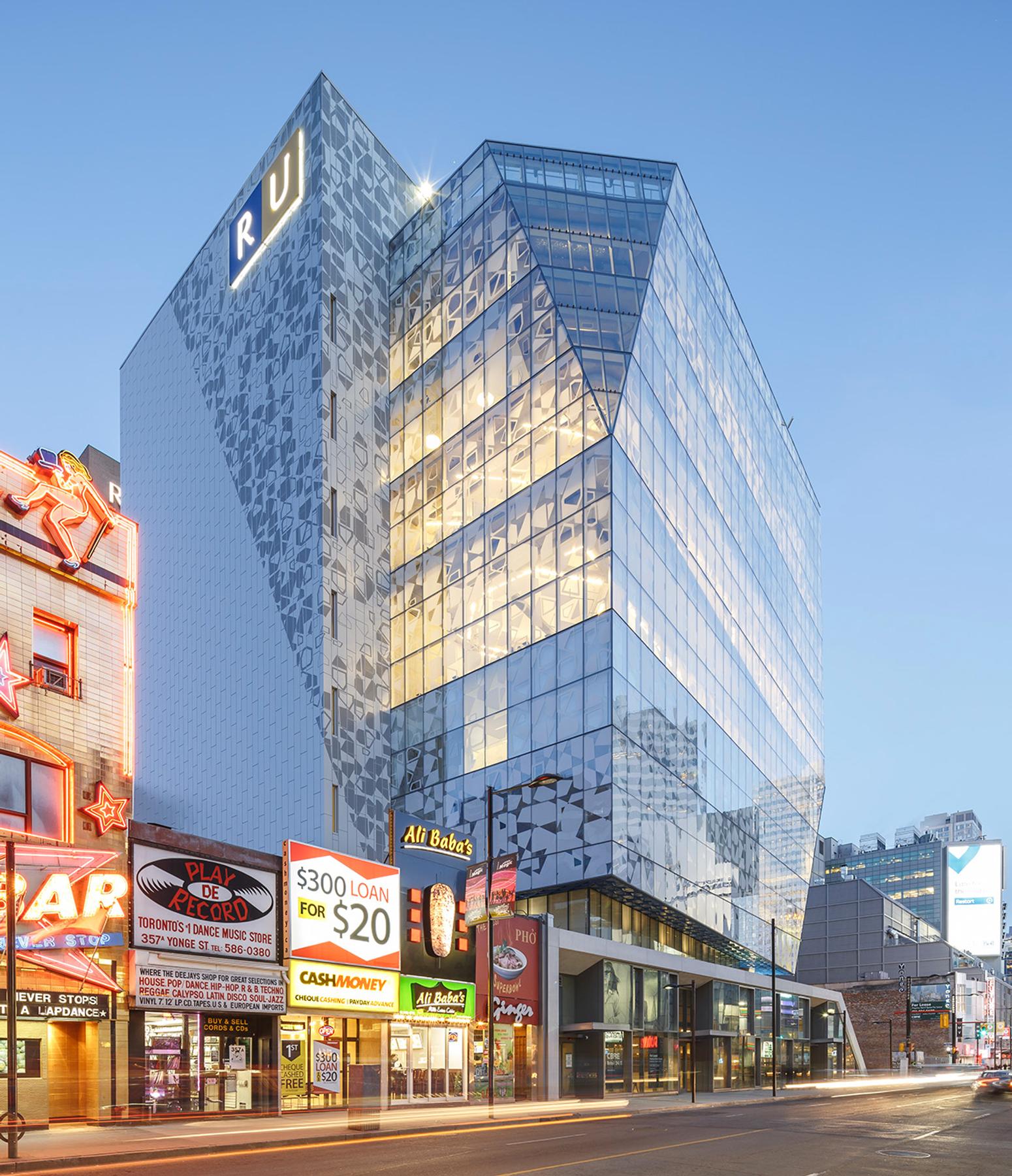 The new Ryerson Student Learning Centre is situated at the bustling corner of Yonge and Gould Streets in Toronto. This 156,000 square foot, nine-storey building showcases an impressive glass facade, including an elevated plaza and bridge connecting to the existing library. The ground floor and basement features prominent commercial retail space facing outwards onto Yonge Street with a transparent glass skin that creates a variety of lighting throughout the building. The facility is barrier free, which encourages a place of social interaction and engagement. It contains student learning centres, labs, and study areas.
