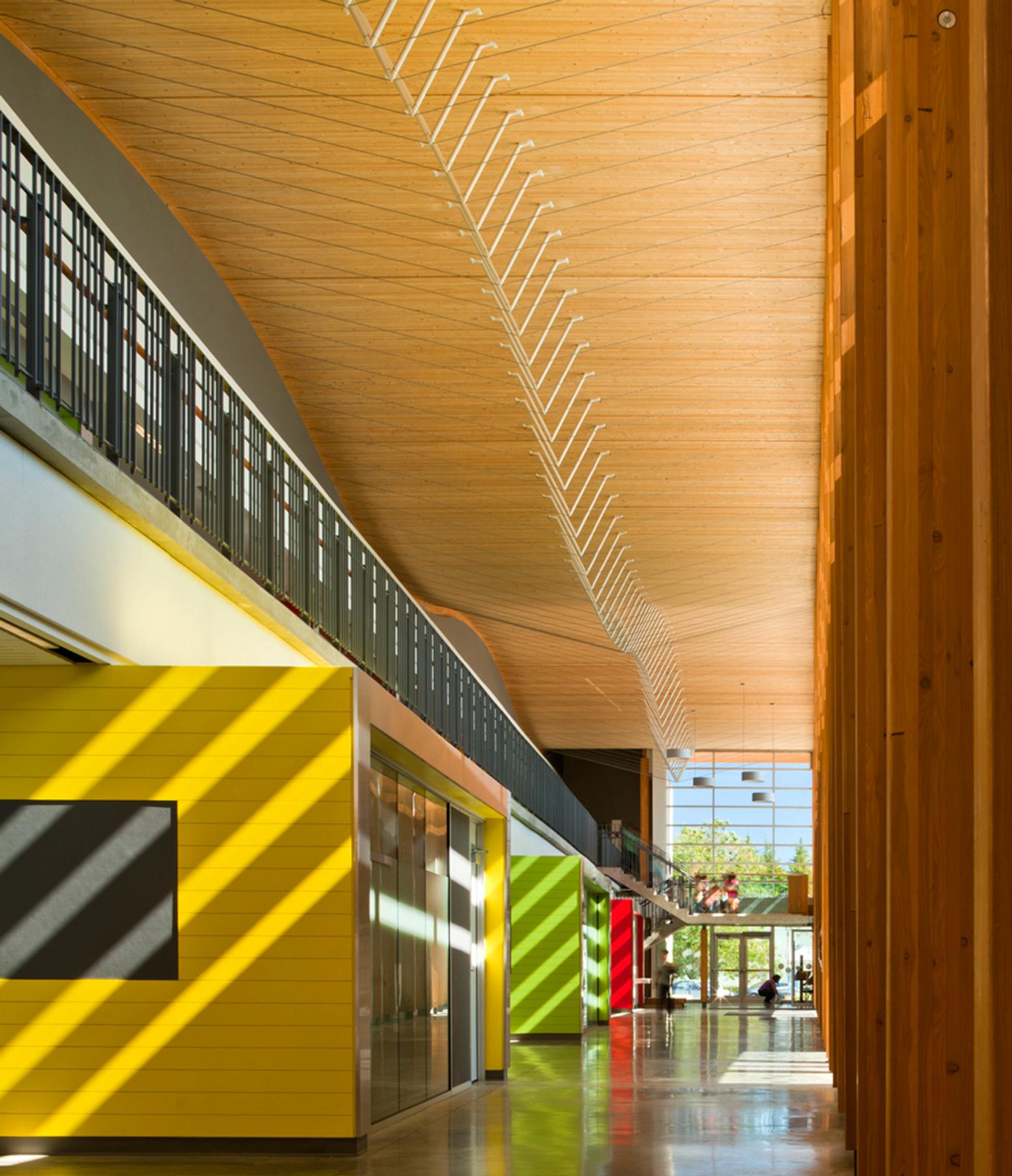 The creation of a memorable space has been fundamental to the Brighouse design, and is included in the project’s Vision Statement. The project steering committee’s desire for a memorable space came out of their desire to find ways the new facility could enhance the learning experience for Brighouse students. This desire was realized by the visionary design of the new school with its distinctive “wavy roof” and dragon-like backbone. The school is also evidently a place for children, with abundant natural light, bright colours, tackable and writeable surfaces everywhere. The new school provides for students a much enhanced pride in their place, and replaces a dark, industrial facility that evidently did not place their needs first.