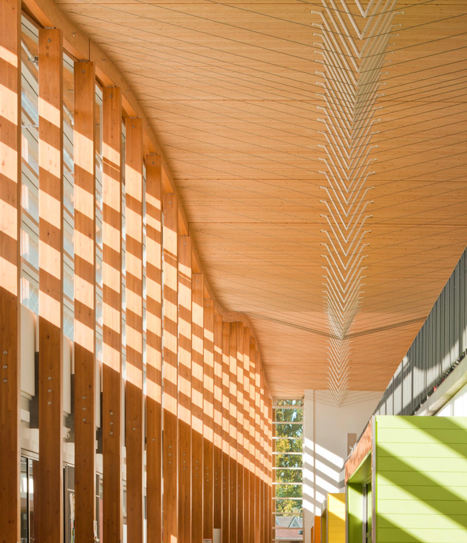 The use of non-off-gassing materials, dematerialization including the use of polished concrete as the main floor finishes and minimal use of suspended ceilings reduces environmental impacts and the potential trapping of contaminants. Also, the use of natural passive ventilation throughout the schools mostly eliminates the use of re-circulated air and also eliminates much of the noise emanating from mechanical fan based systems. Furthermore, the use of sophisticated controls allows for the monitoring and control of air quality in each room. Another design innovation is the expansive roof overhangs which provide ample outdoor play areas protected from rainfall and other inclement weather conditions, thus allowing outdoor physical activities to occur in all seasons.