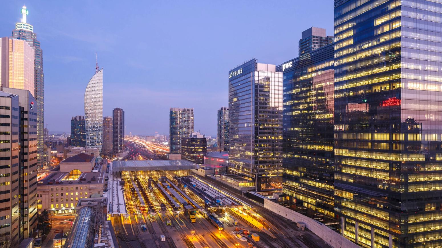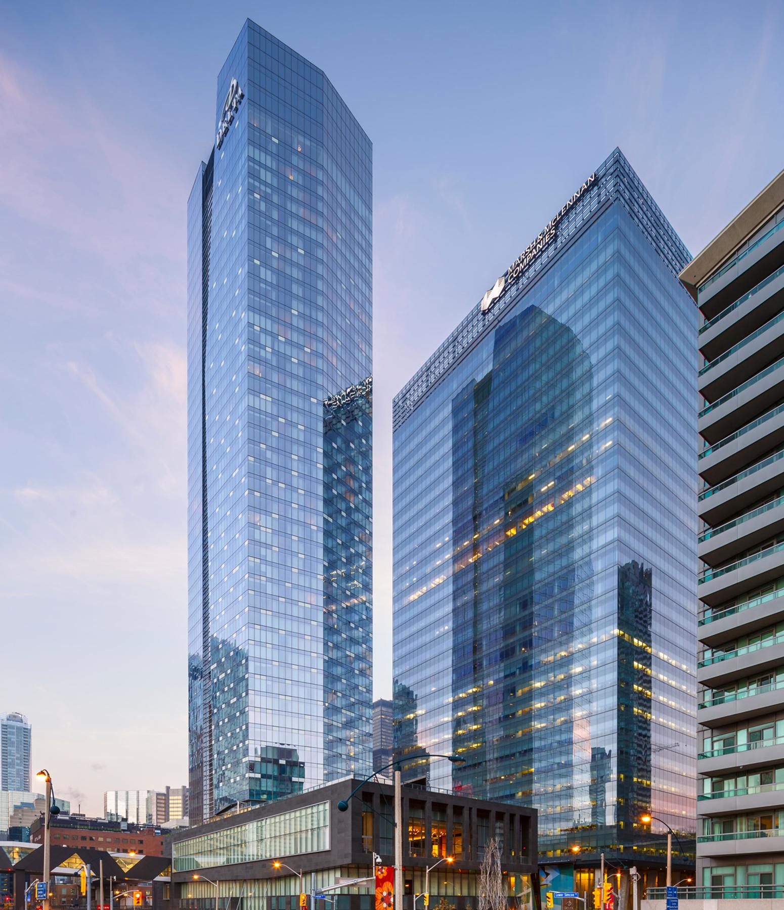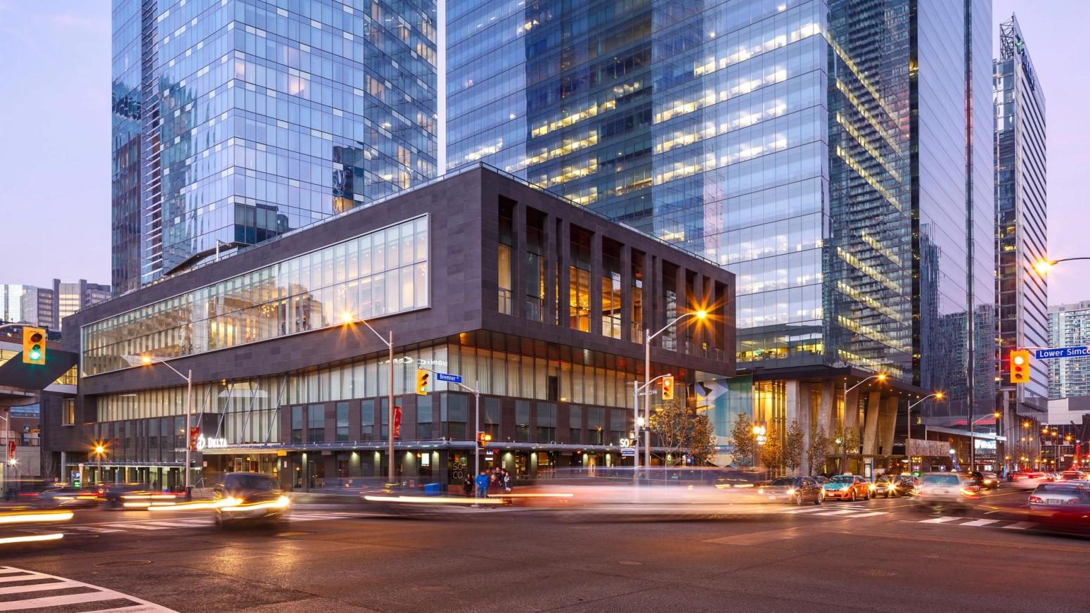 The centre encompasses a full block in the southern part of the downtown core from York Street to Lower Simcoe Street, is within walking distance of King and Bay, and provides enclosed pedestrian access to Union Station, the Metro Toronto Convention Centre and the PATH network.