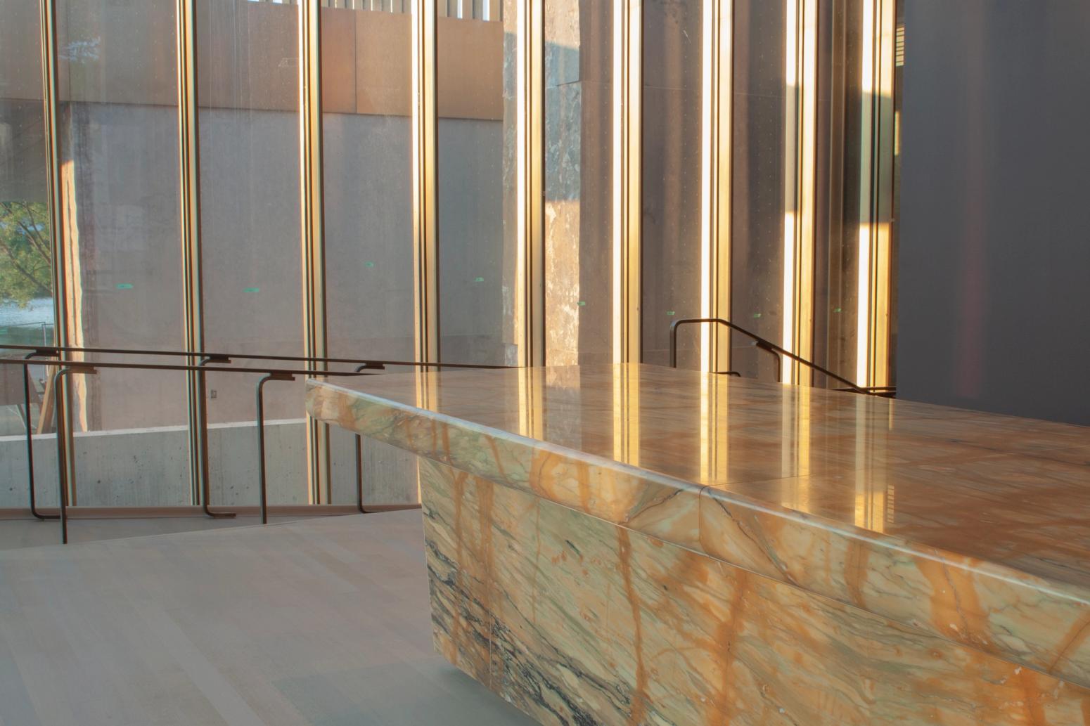The building features continuous perimeter steel outriggers to frame the complex curvature of the building. The perimeter framing is supported by exposed custom steel plate columns, which are presented as elegant elements that enhance the curvature of the building. The front entrance canopy consists of a large double cantilever supported by one exterior cruciform column. The structural system includes reinforced concrete below grade, full height concrete walls surrounding the theatre bowl and steel frame above. Due to the centre’s unusual shape and design, highly specialized glass suppliers from Italy and Spain manufactured the multiple different radii of curved glass panels for this project. The team worked with many international suppliers including brick from Denmark, interior stone from Italy, Greece and Turkey and the white oak flooring was imported from Italy. At the heart of the building is the intimate 615-seat bowl-shaped auditorium, surrounded with full height concrete walls clad in softly lime-washed brick.
