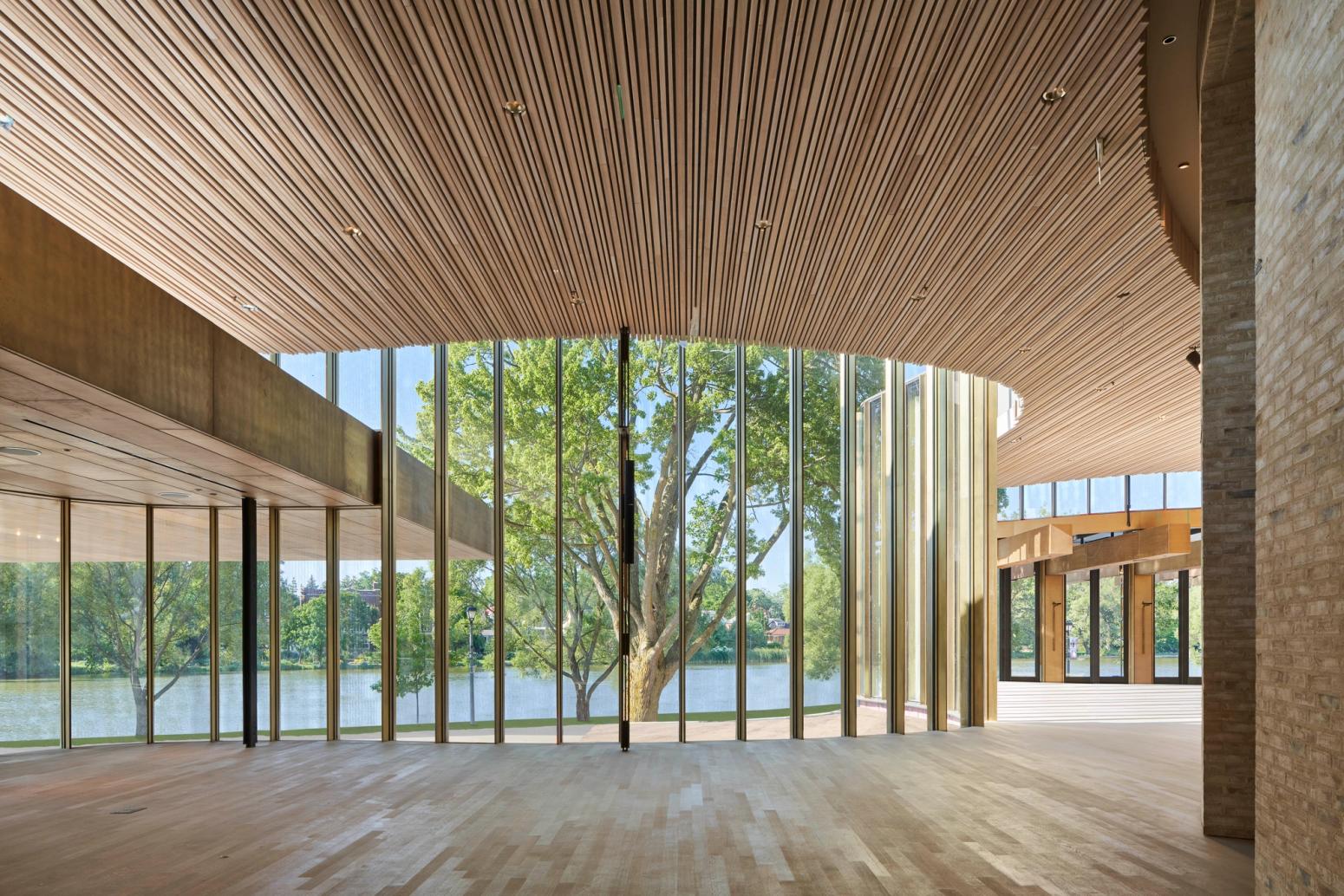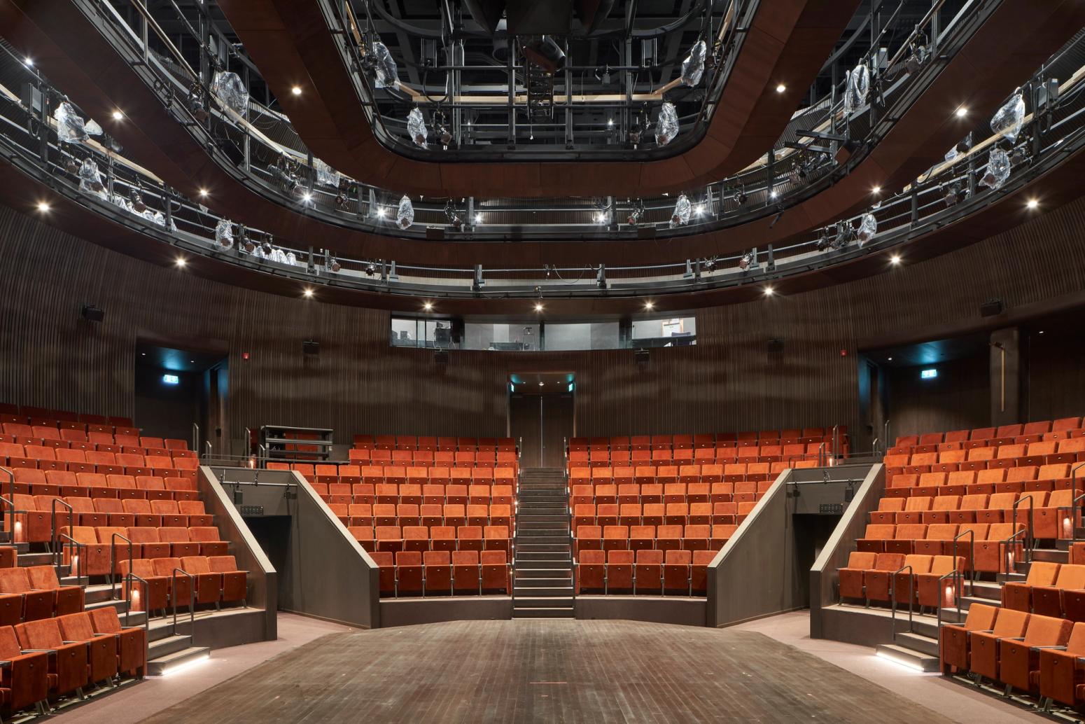 The theatre is designed to honour all that is cherished about the beloved Tom Patterson; the unique elongated thrust stage, the pronounced stepping of the tiers that provide clear site lines, and the unparalleled intimacy. Inside this primary assembly, a curved custom acoustic wood slat wall and ceiling provides both acoustic absorption and reflection to achieve proper speech delivery and room acoustics while creating a unified look throughout the interior. Technical catwalks are clad in curved walnut panels and provide further reflection to ensure speech is intelligible by all patrons while also enhancing the visual experience of the space. Custom wood doors throughout the project were designed to ensure openings would not degrade the acoustic performance of the space while also marrying with the overall architectural vision and warm material palette.