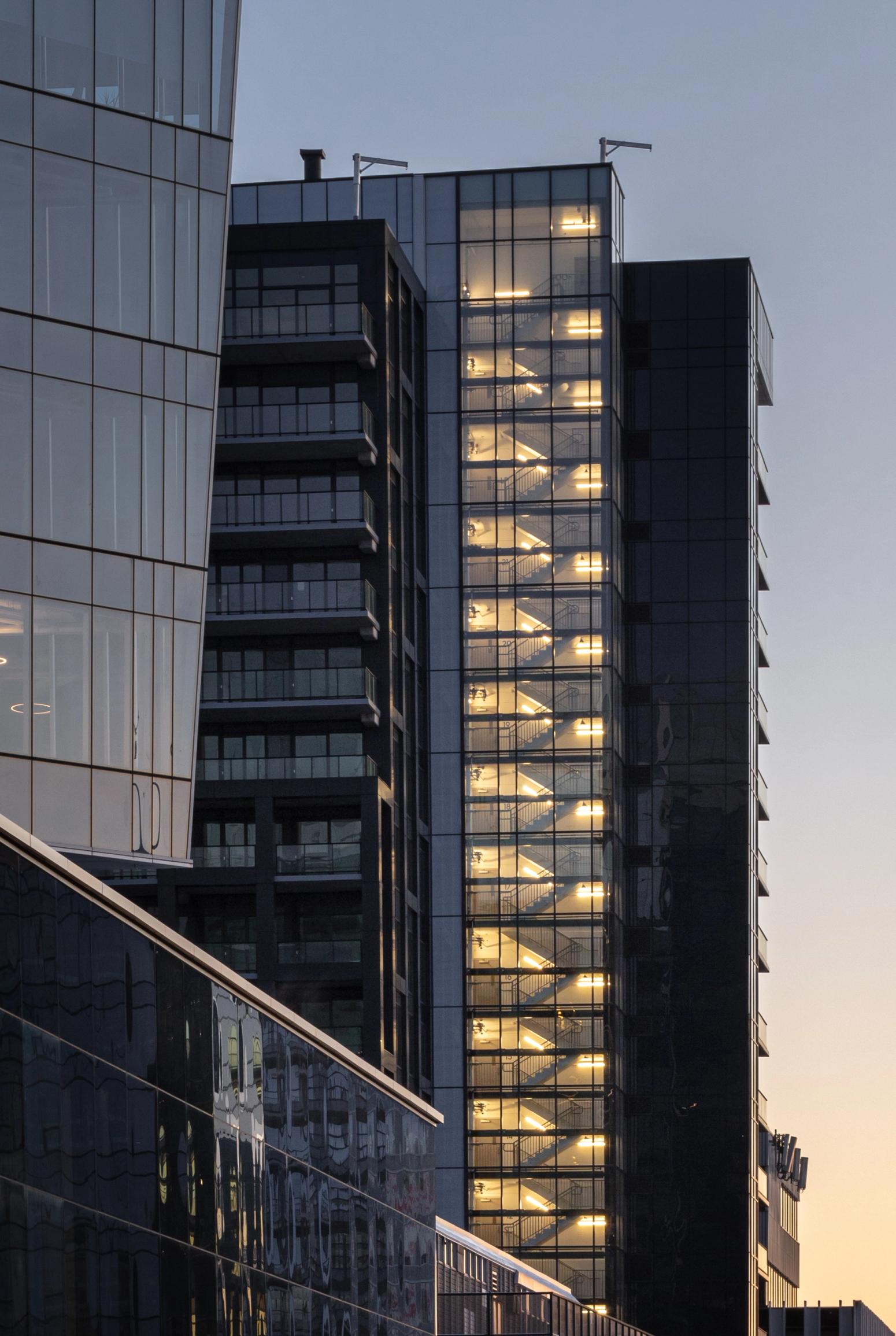 The Roy Building project includes a High Rise condominium consisting of a concrete structure. The building comprises a total of 23 floors with 3 floors of commercial space and 4 floors of above grade parking, which is serviced by 2 vehicular elevators. There are a total of 112 high-end condominium units contained within the building tower. The amenities include a pool, fitness area, sauna and common areas for the building owners. The typical floor plate area for the tower is a little under 13,000 square feet, while the parking and podium floors are 18,000 square feet. The exterior envelope of the structure provides a combination of masonry for the podium area, and window wall/curtain wall for the main tower.