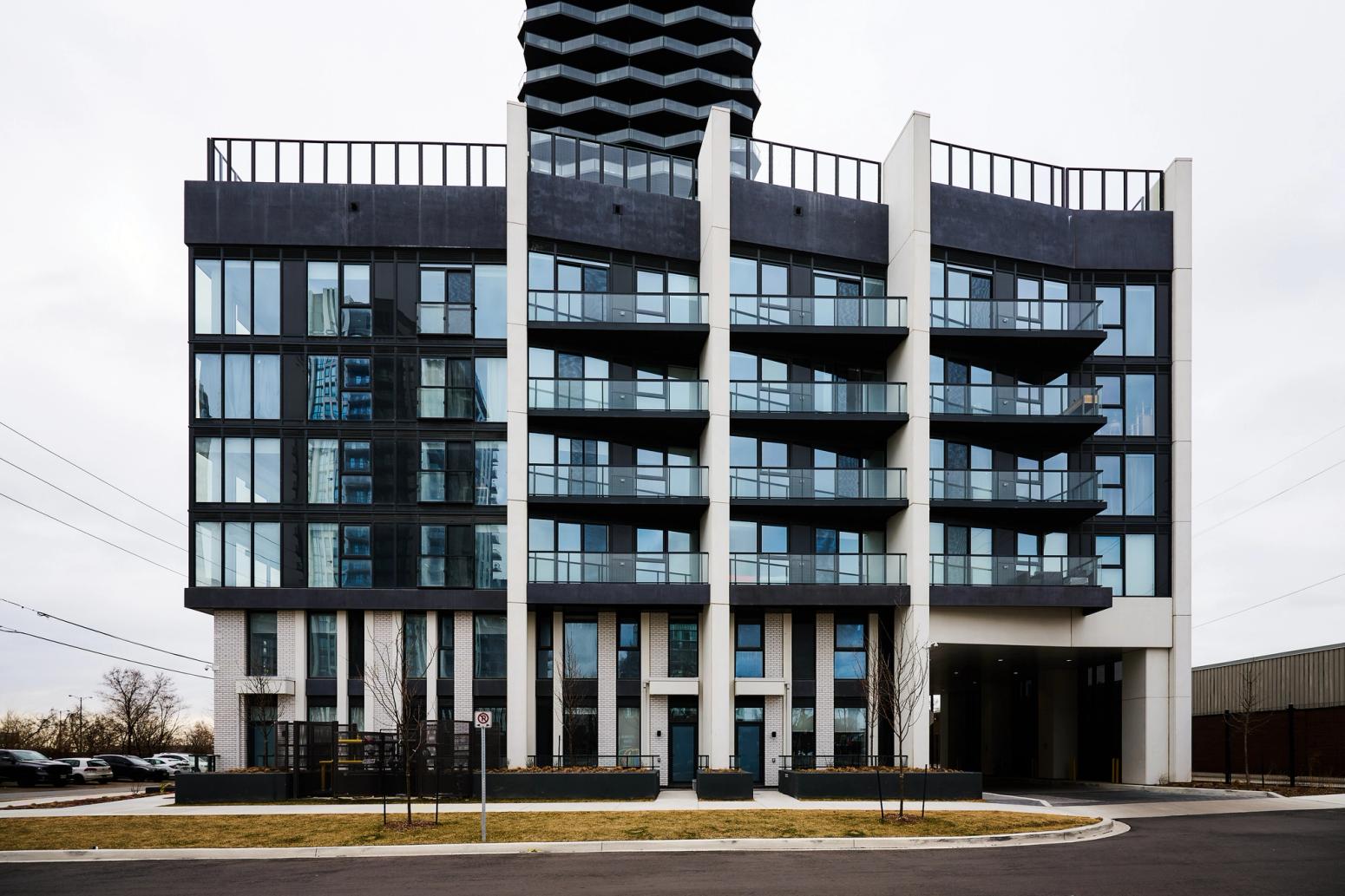 The tower's residential offerings consist of a mix of studios, one-bedroom, one-bedroom plus den, and two to three-bedroom suites. The six-story podium is topped with a green roof and terrace space for resident amenities. An underground parking facility accommodates 449 vehicles, ensuring ample space for residents and visitors alike.