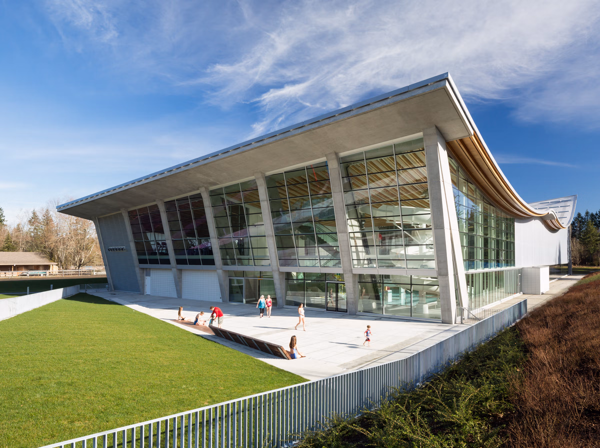 Mass-timber aquatic centre with FINA pool, curved roof, and wellness amenities built for sustainability and performance.