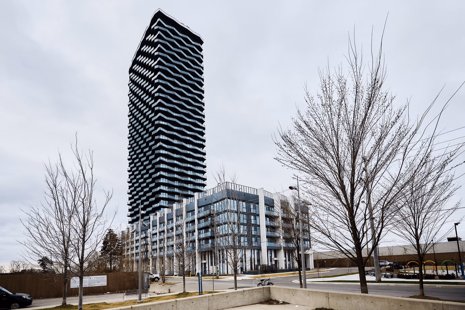 36-storey condo in Toronto with 459 units, rooftop pool, gym, green terrace, and on-site park.